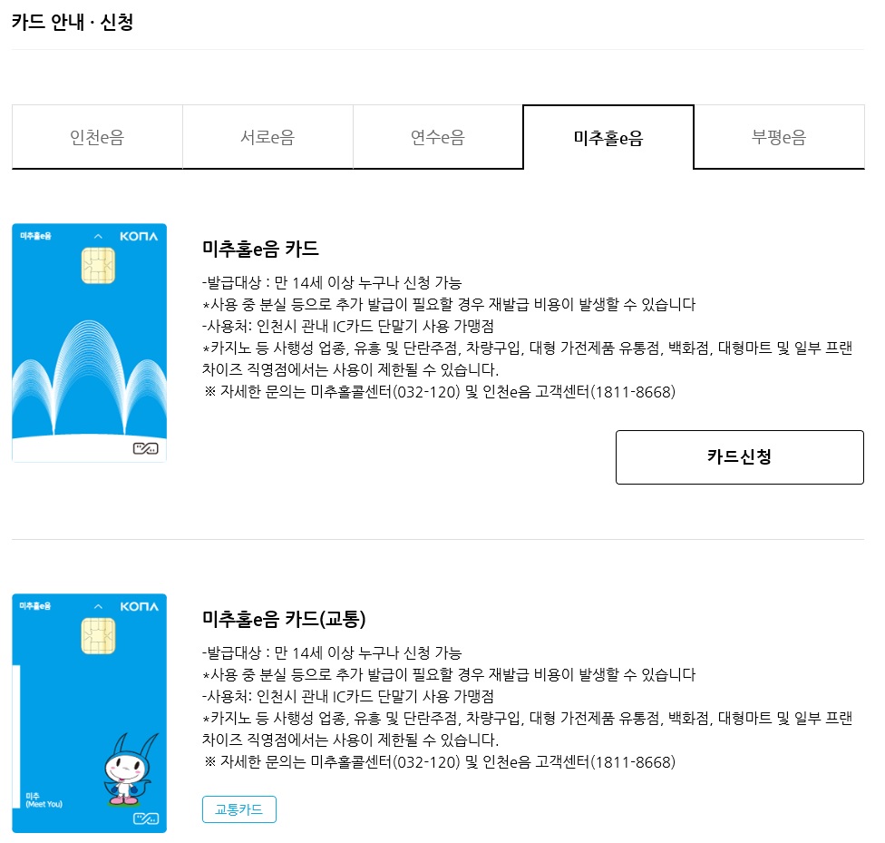나는 미추홀구에 거주하고 있어서 미추홀e음 카드를 사용중이다.