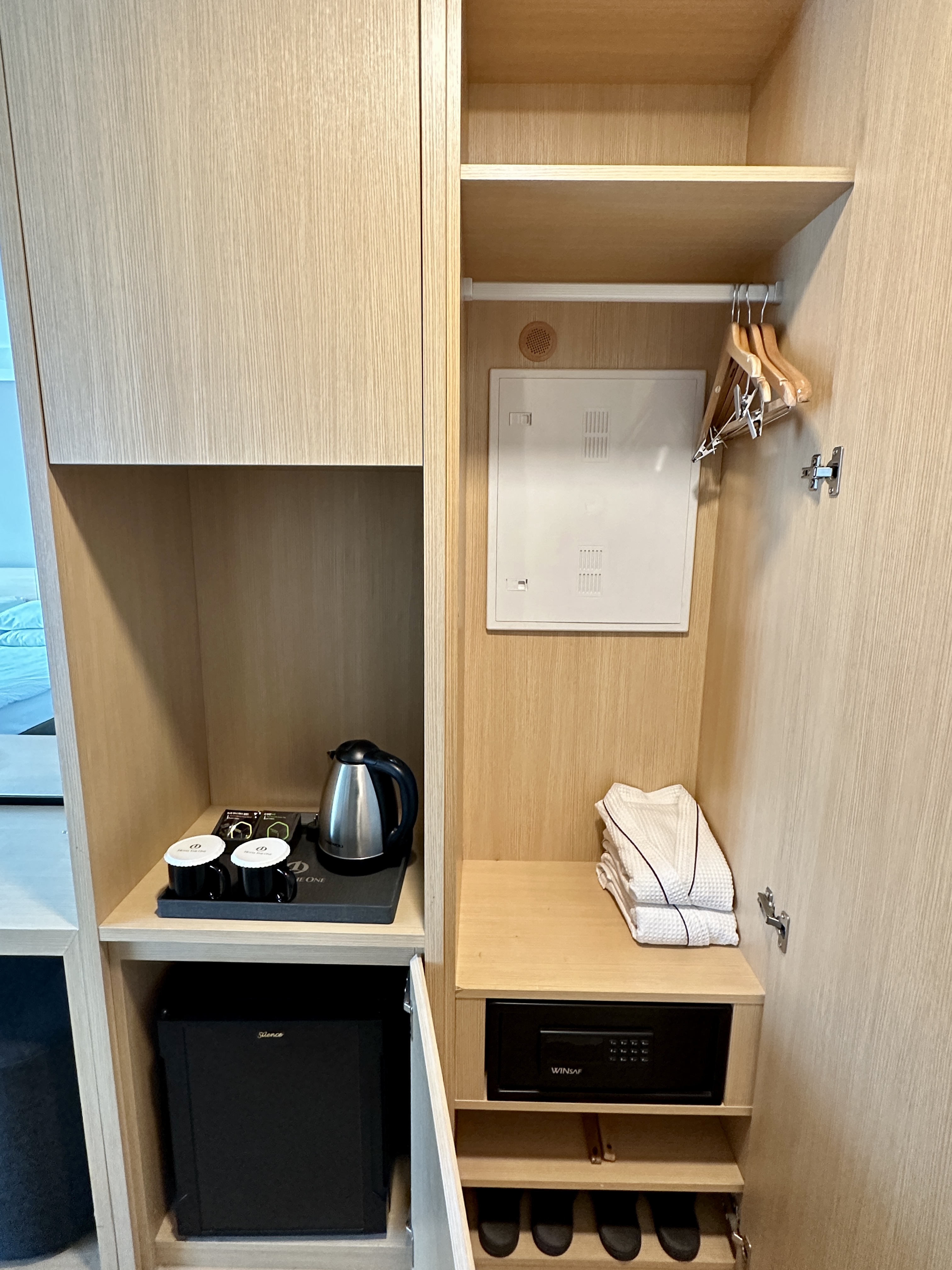 하루에 무료 생수 2병과 목욕가운과 실내화 그리고 티포트와 헤어 드라이기 까지 모두 구비되어 있습니다.