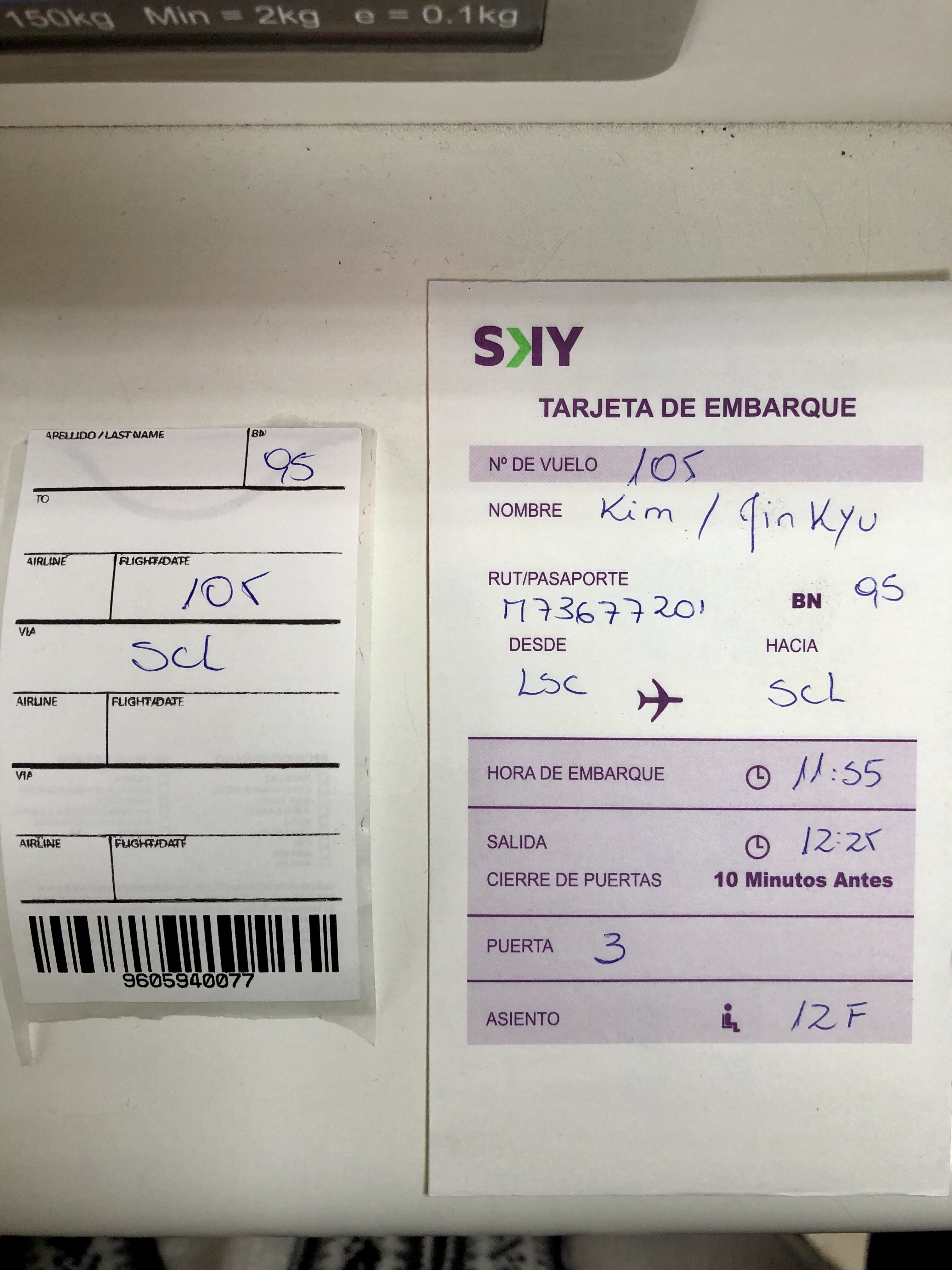 내가 타야하는 스카이 항공의 2 letter code는H2로, H2105편을 타고 칠레의 수도 산티아고로 향한다.