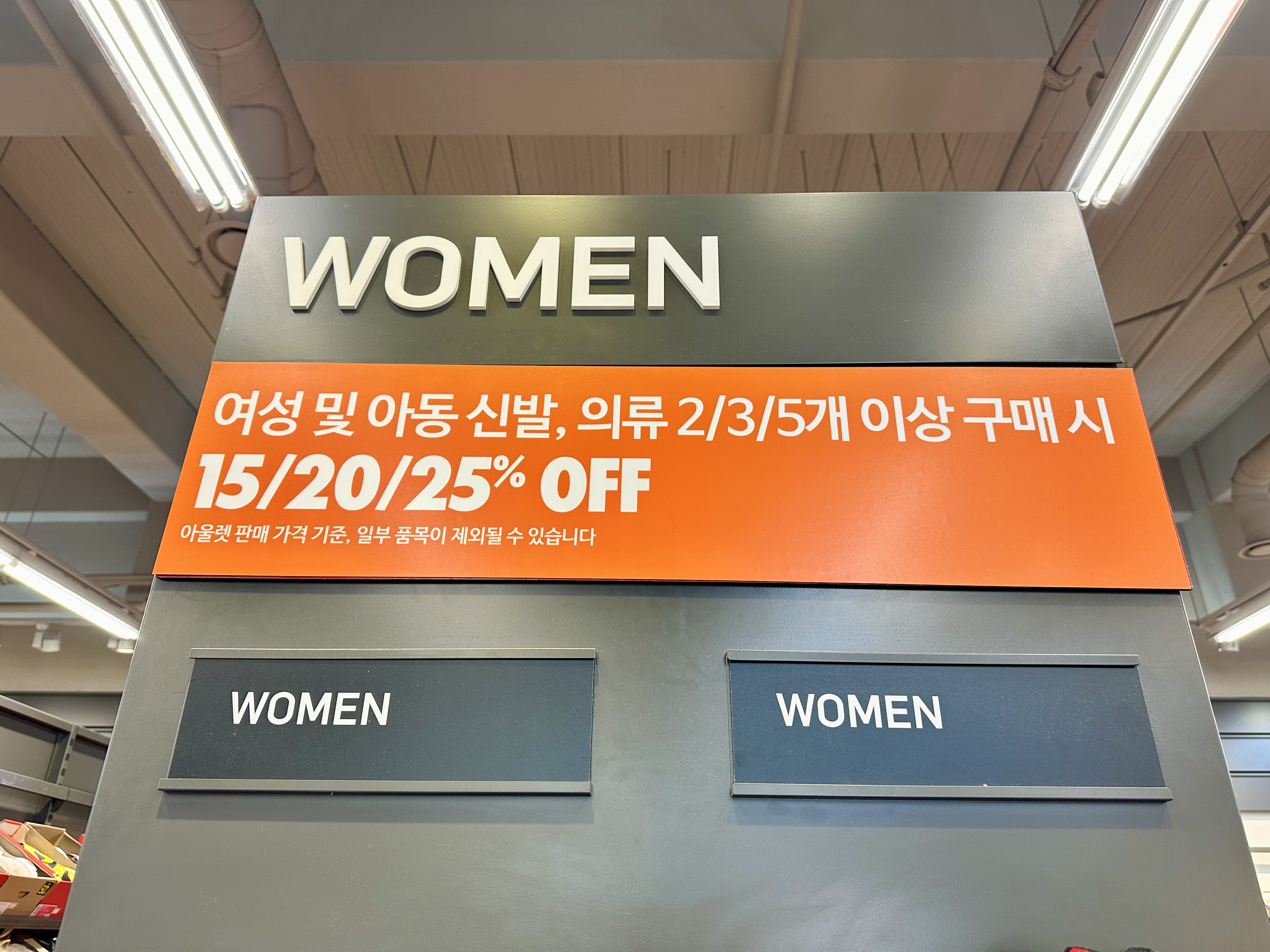바로 여성 및 아동 신발이나 의류에서 2/3/5개 이상 구매시, 15% /20% /25% 추가 할인된다고 합니다.