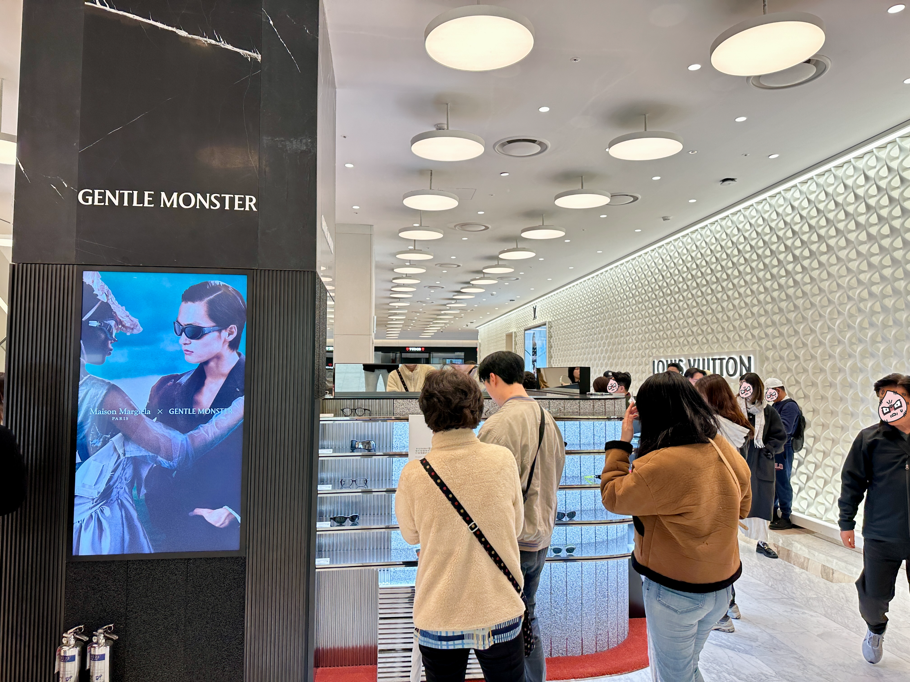 더현대 서울 1층 가장자리 위주로 명품관 매장들이 입점해 있고, 중간부분에는 화장품을 파는 섹션이 있고, 젠틀몬스터도 메종마르지엘라와 콜라보한 안경들을 전시 및 판매하고 있었습니다.