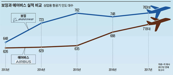 2017년 보잉은 763대, 에어버스는 718대의 민간 항공기를 생산·인도했다.