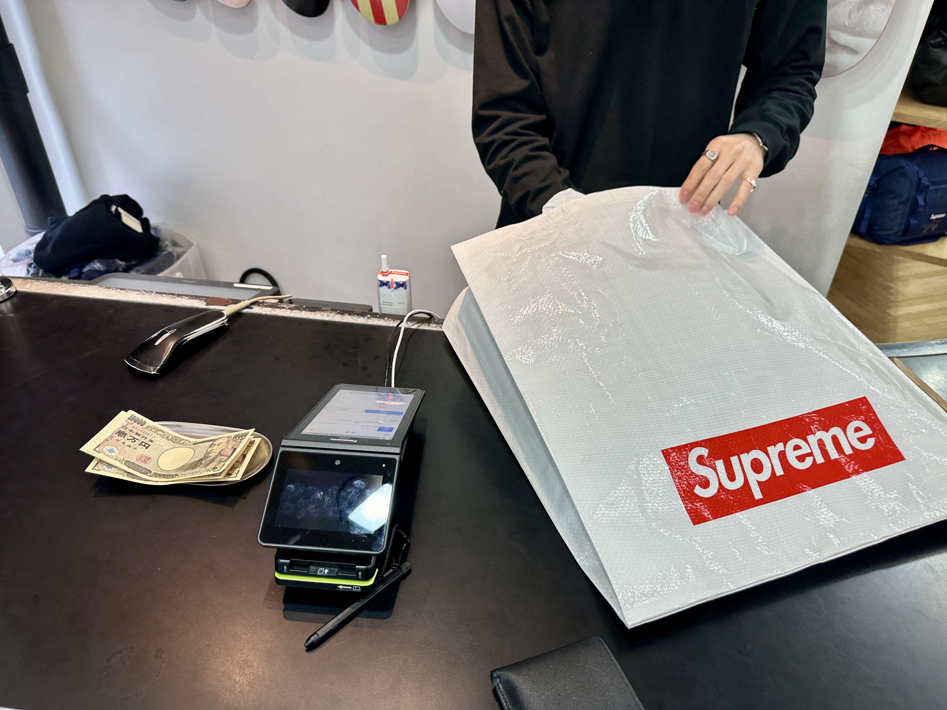 일본 슈프림은 택스리펀드가 되지 않는 것으로 유명한데, 역시나 계산대에 No tax free 라고 써놨습니다.