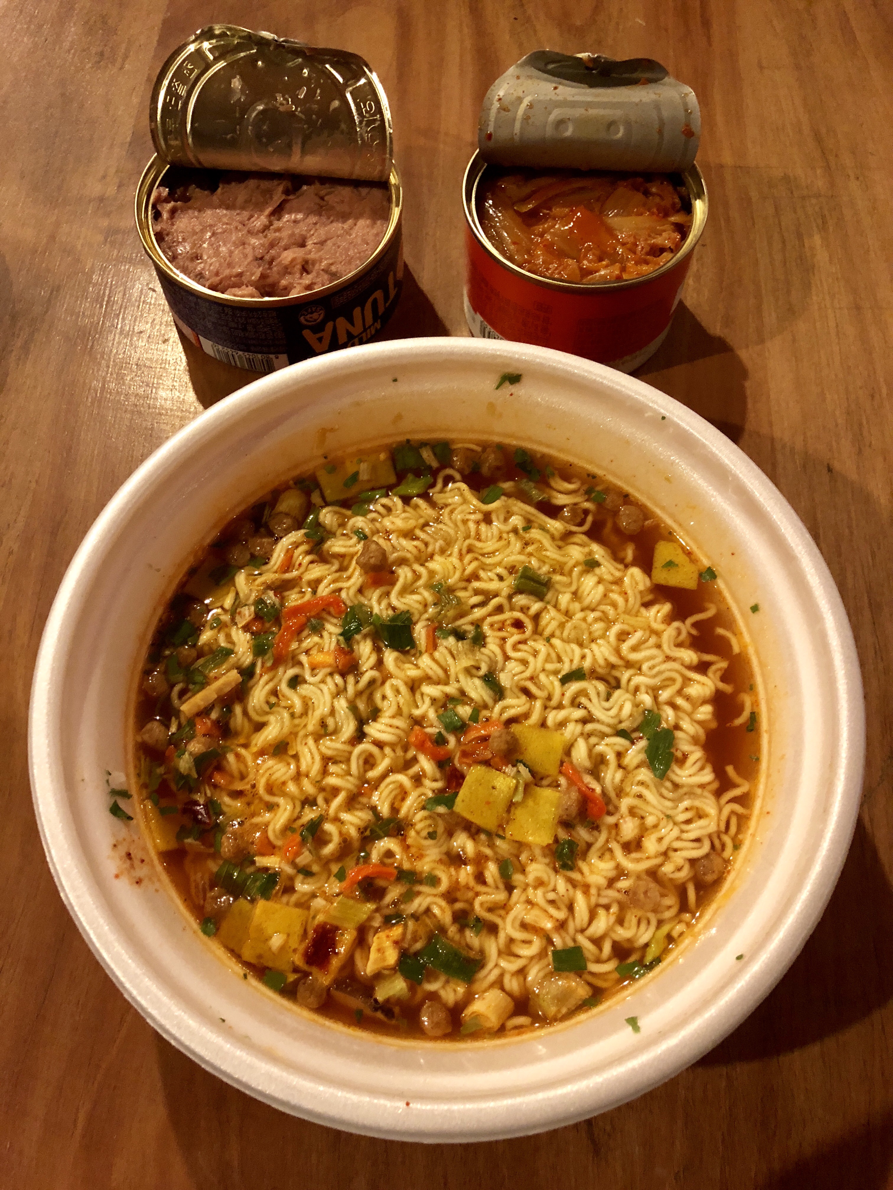 식전주를 마시니 얼큰한 국물이 생각나 사온 라면과 참치를 바로 개봉했다.