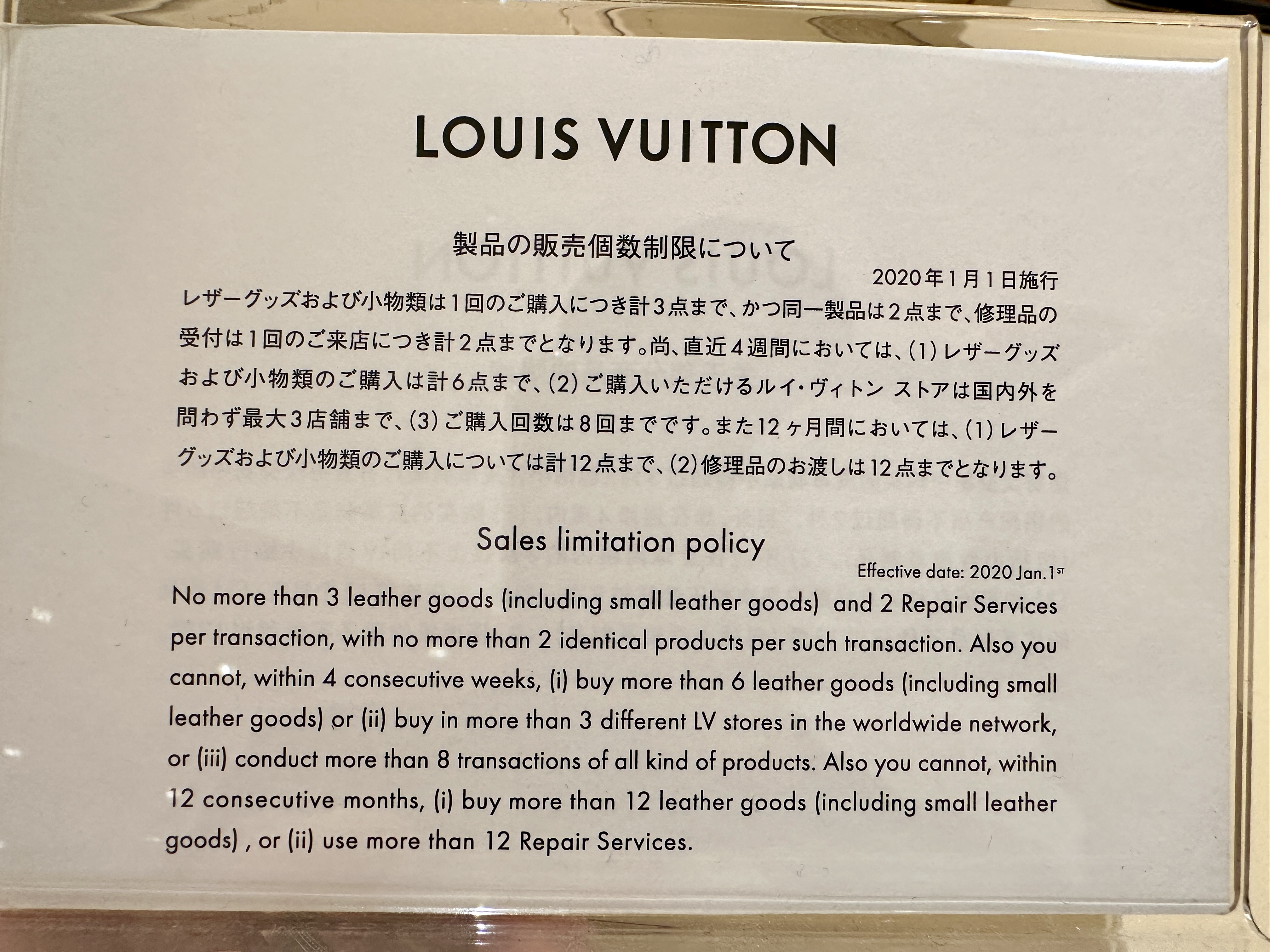 그러나 일본 루이비통 판매 제한 규정에서는 3개 이상의 가죽제품을 한번에 구매가 불가능하다고 합니다.