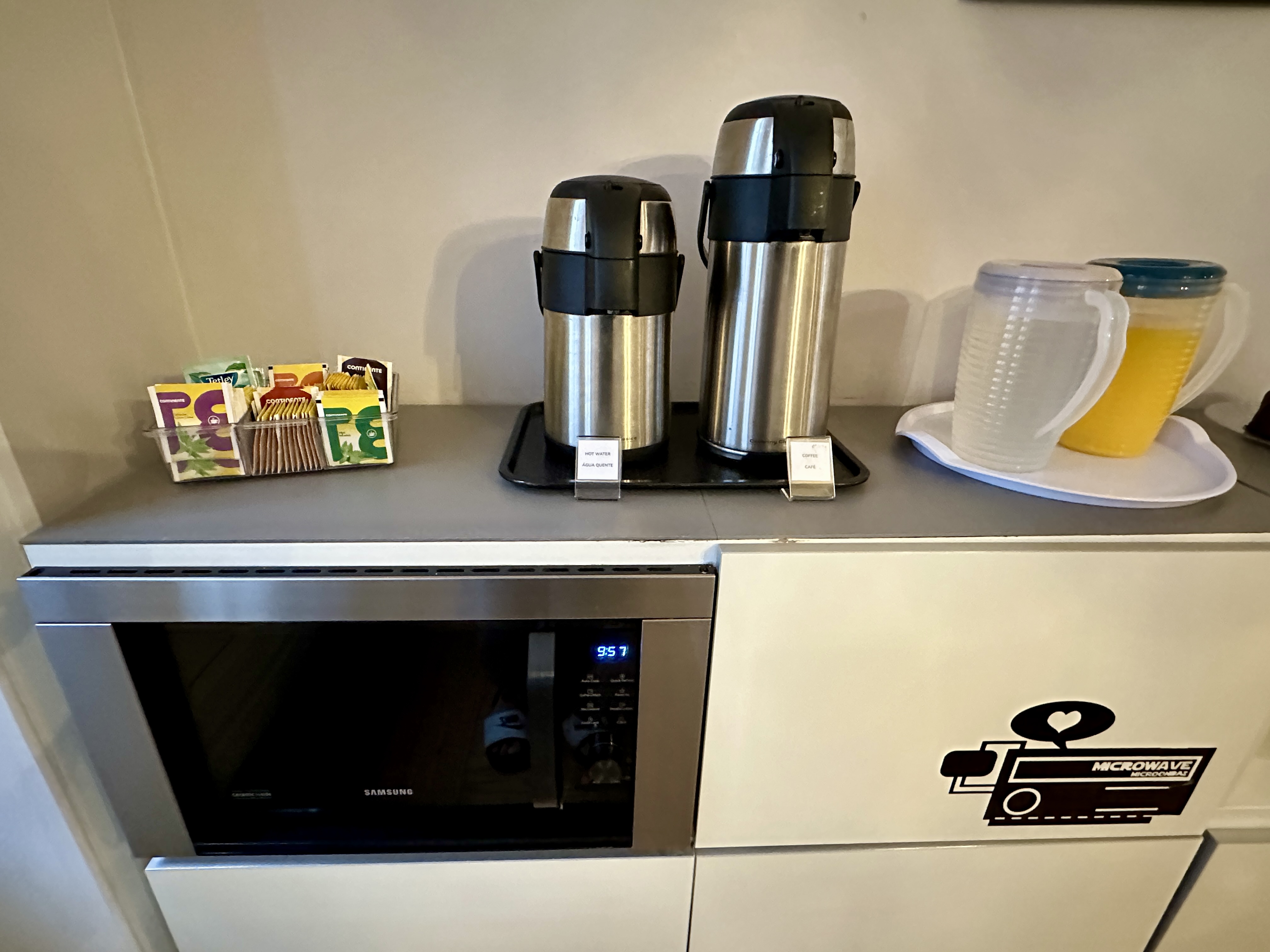 차나 커피를 마실 수 있고, 간식으로 머핀을 먹었습니다.