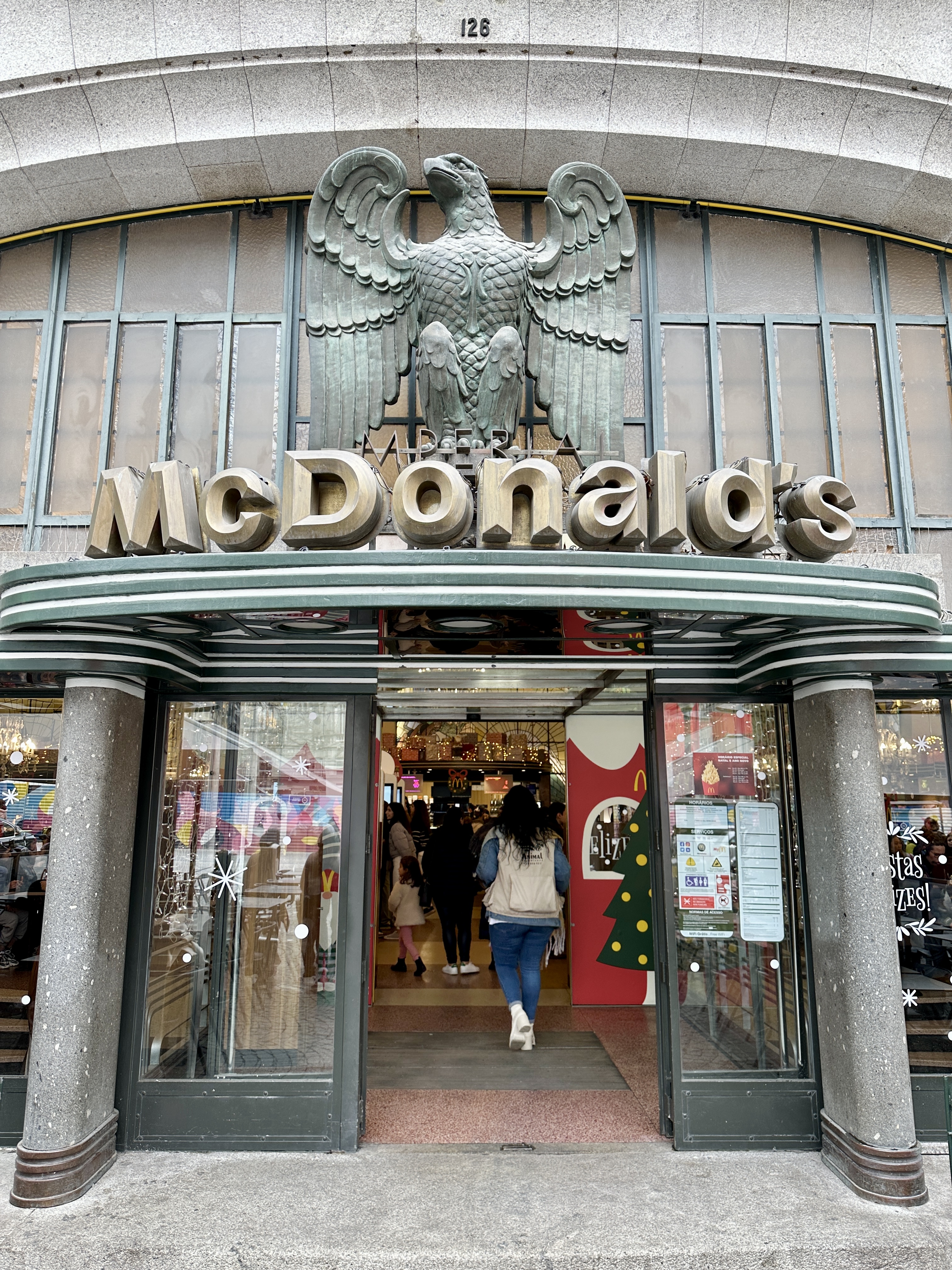 Avenida dos Aliados에 있는 맥도날드에 접근하면 가장 먼저 눈길을 끄는 것은 놀라운 아르데코 양식의 외관입니다. 건물의 외관은 화려한 조각과 입구 위에 자랑스럽게 자리잡은 장엄한 독수리 조각 등 복잡한 세부 묘사를 자랑합니다. 이 웅장함은 전 세계 맥도날드 매장 대부분의 전형적인 미니멀리스트 디자인과 극명한 대조를 이룹니다.
