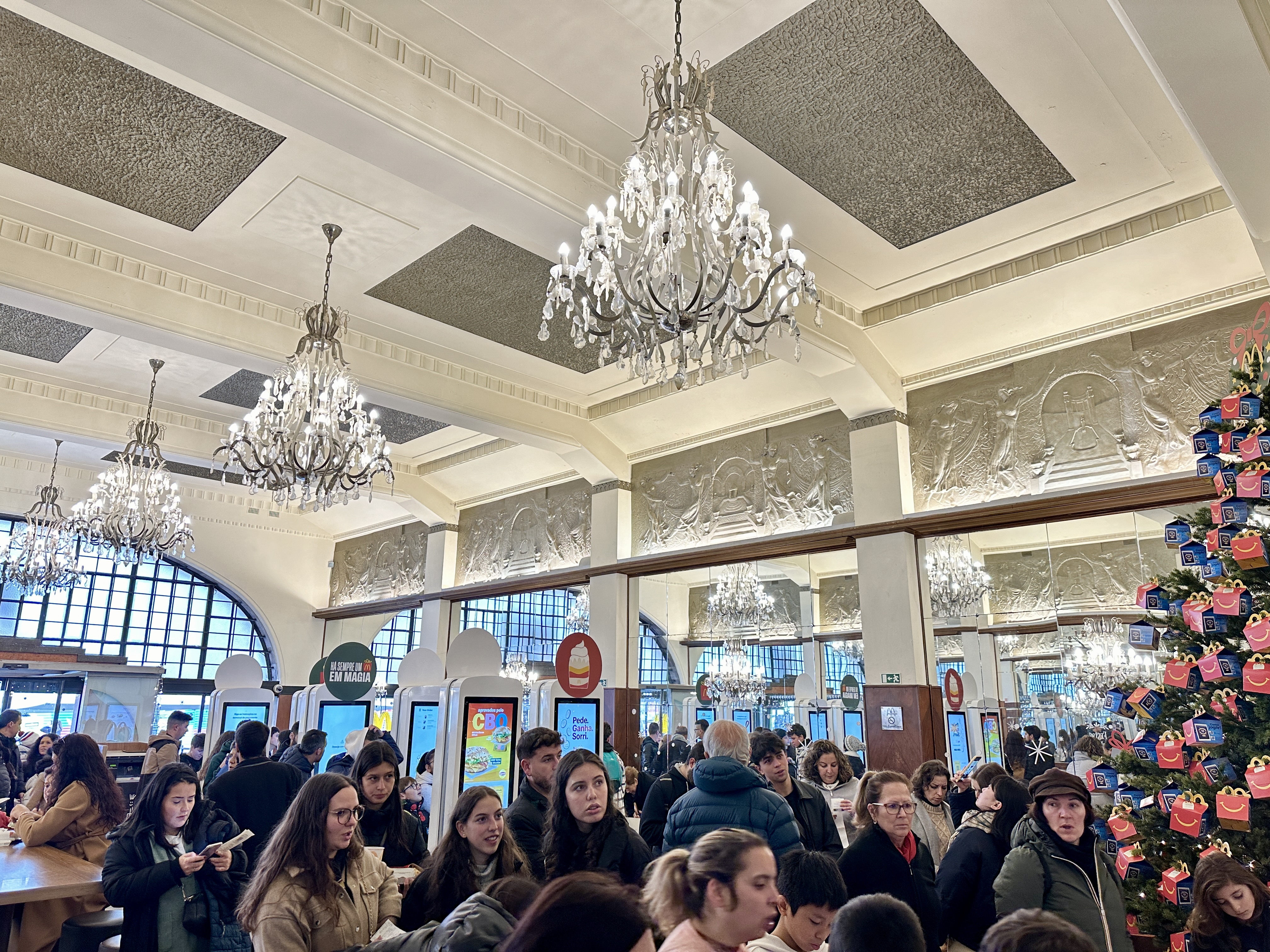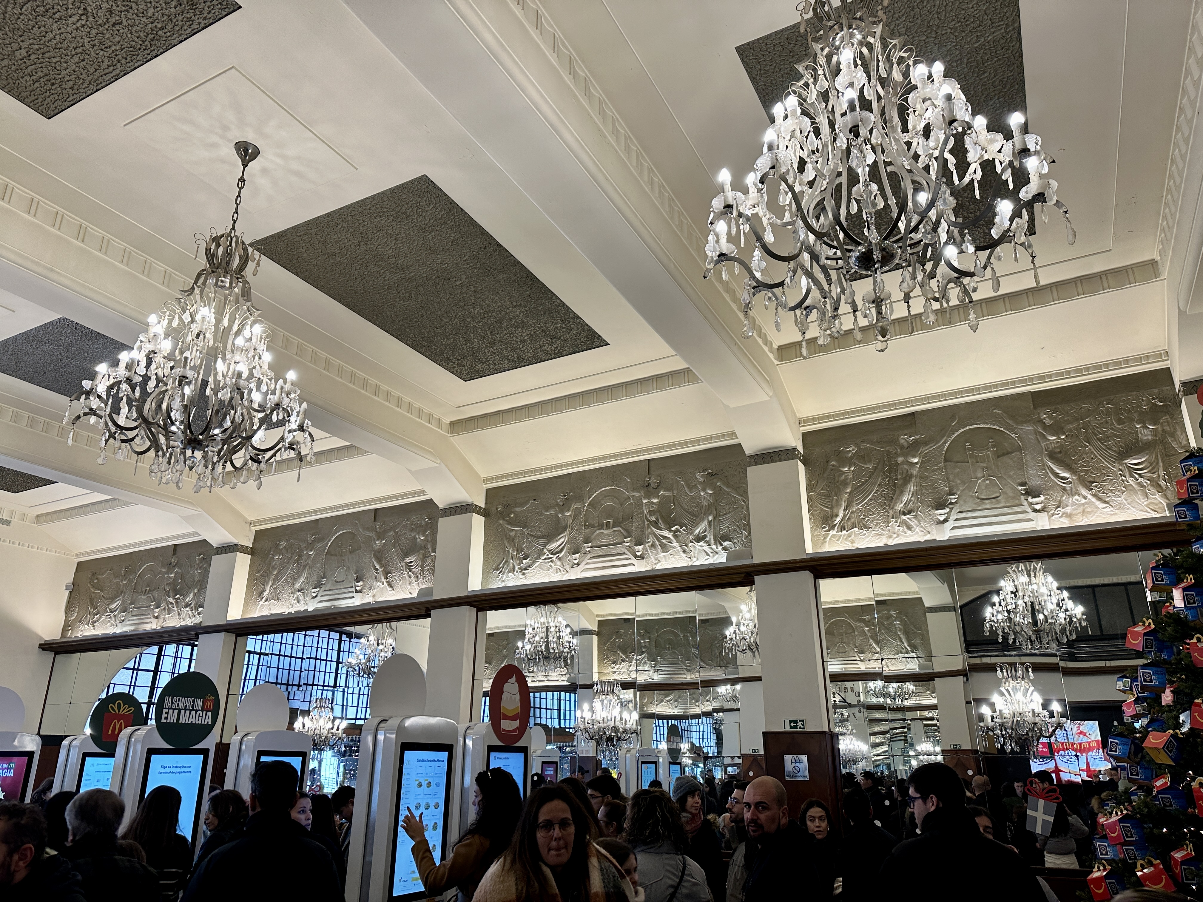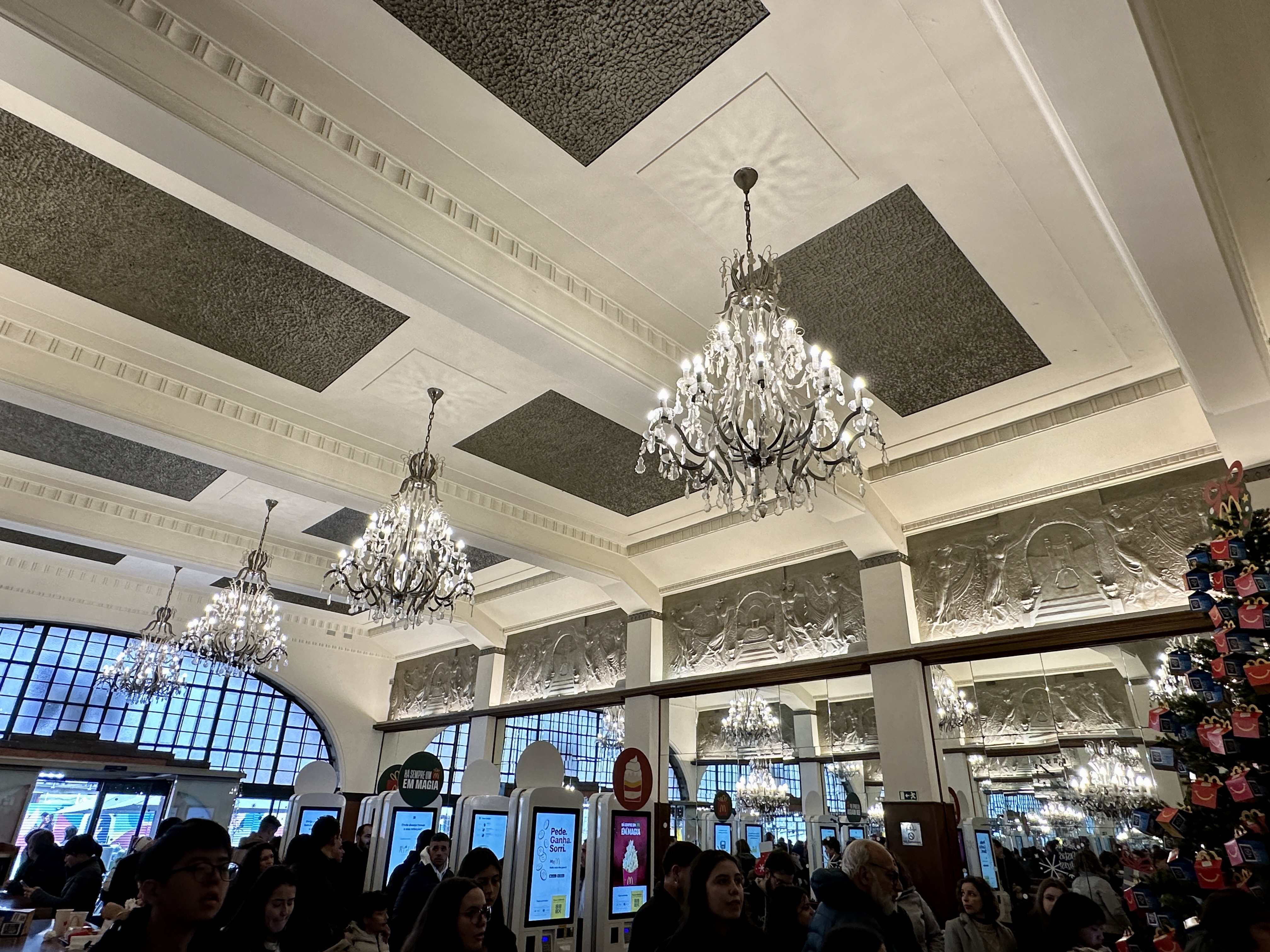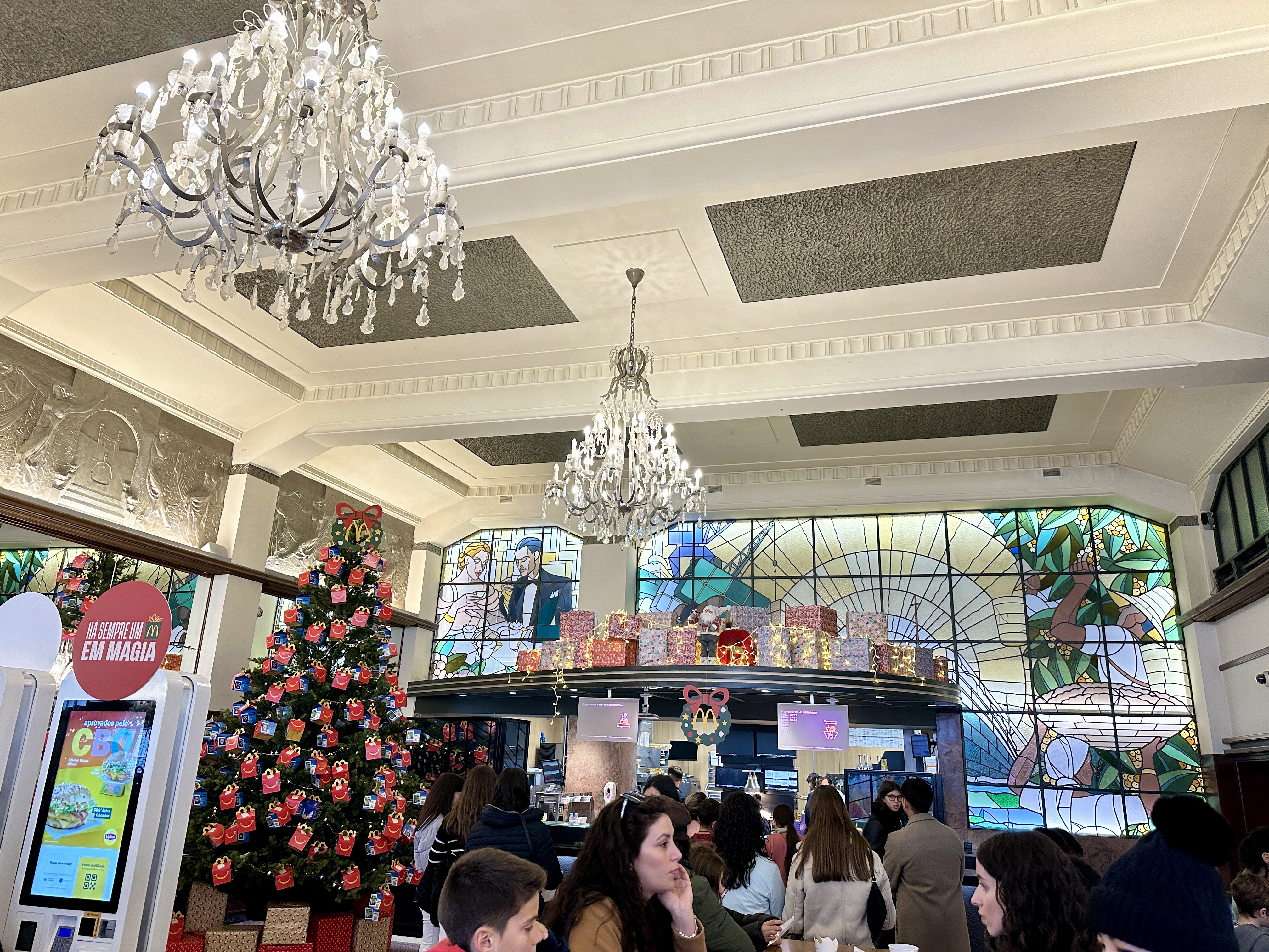 세계에서 가장 아름다운 맥도날드는 화려한 인테리어로 매장 안으로 들어서면 패스트푸드점이라기보다는 호화로운 카페 같은 느낌의 인테리어가 반겨주는데, 웅장한 샹들리에로 장식된 높은 천장이 단번에 시선을 사로잡습니다.