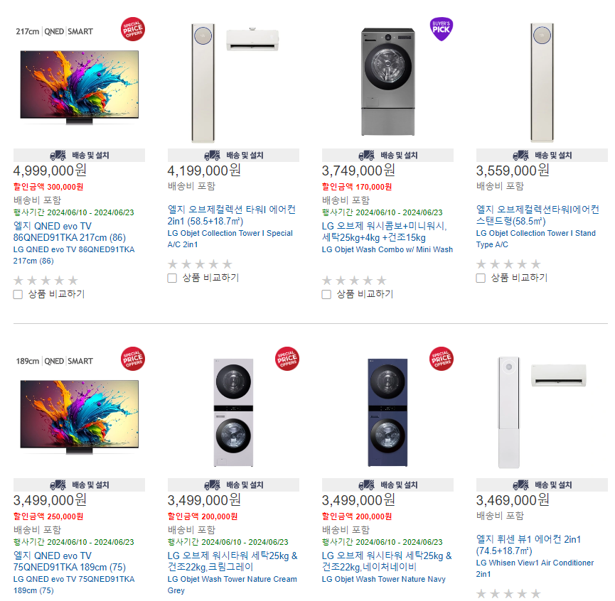 행사품목 : 엘지 QNED evo TV, 엘지 오브제컬렉션 타워 에어컨, LG 오브제 워시콤보 등