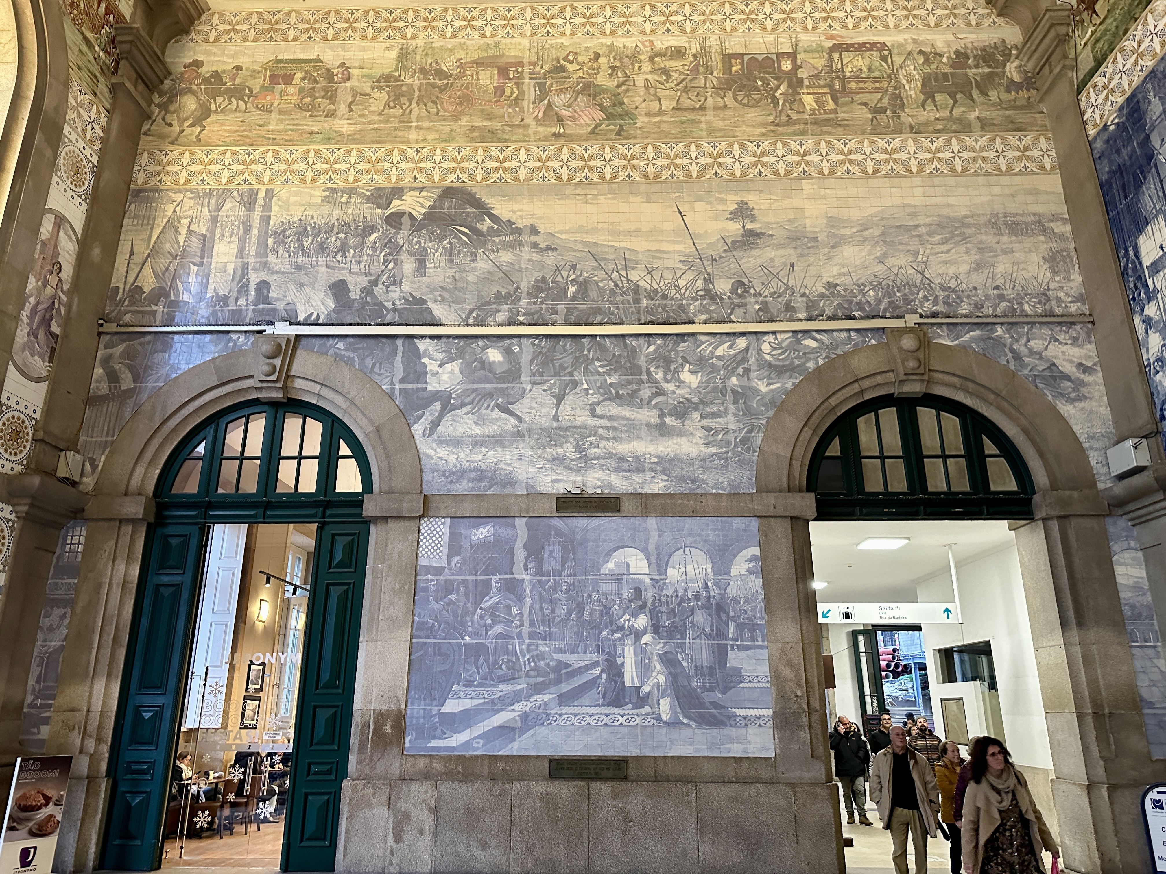 상 벤투역 내부의 아줄레주는 입구를 들어서자마자 왼쪽 상단을 보면 1140년 레온왕국으로부터 독립하기 위한 1차 독립 전투를 그린 역사적인 그림을 볼 수 있고, 왼쪽 하단에는 레온 왕국의 알폰소 8세를 표현했는데 오른쪽 인물들은 포르투갈의 시조인 아폰수 1세의 교사인 에가스 모니즈 지 리바도우루와 그의 가족들이라고 합니다.