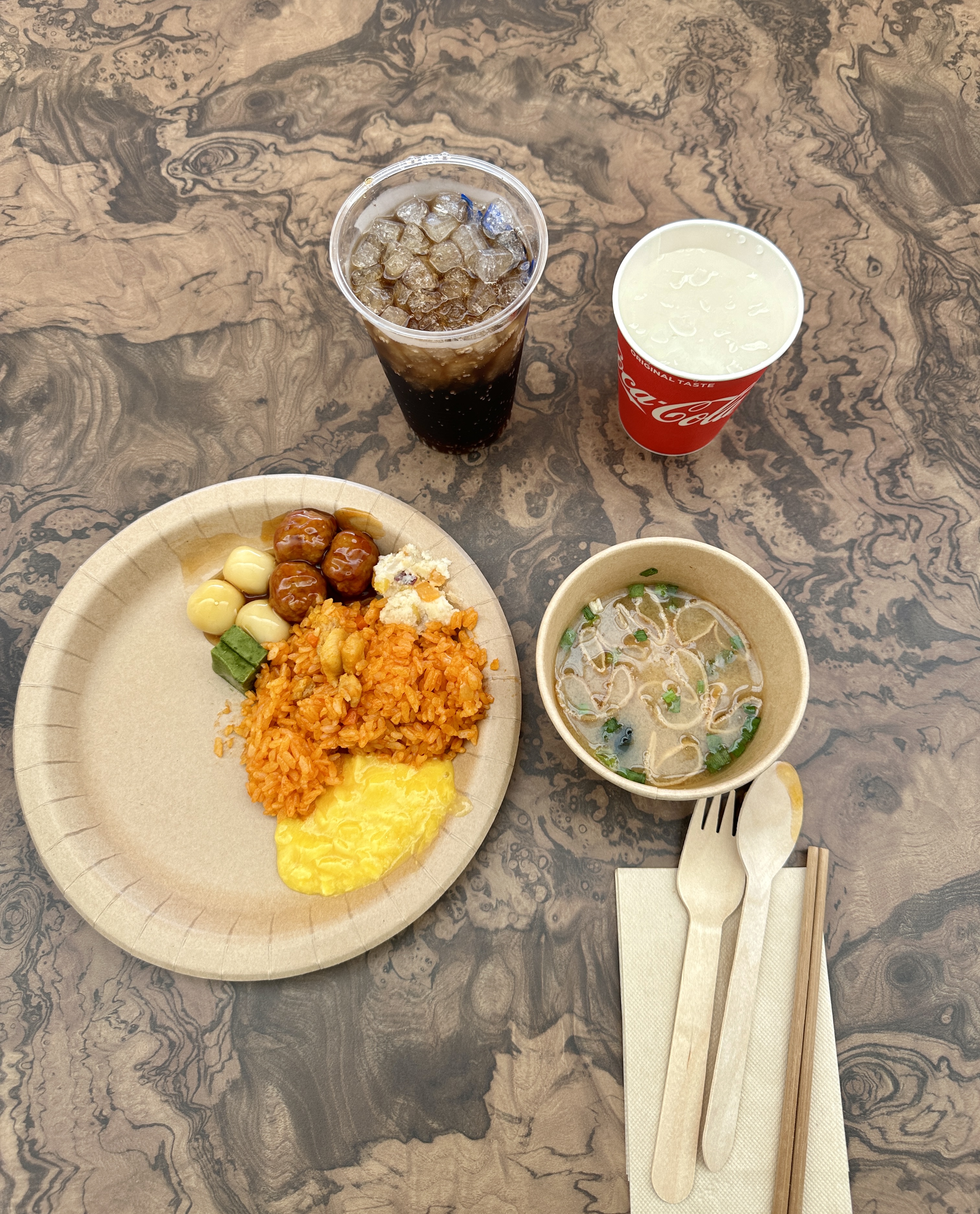 식사로는 주로 볶음밥과 된장국을 먹고 디저트로 커피와 견과류를 즐겼습니다.