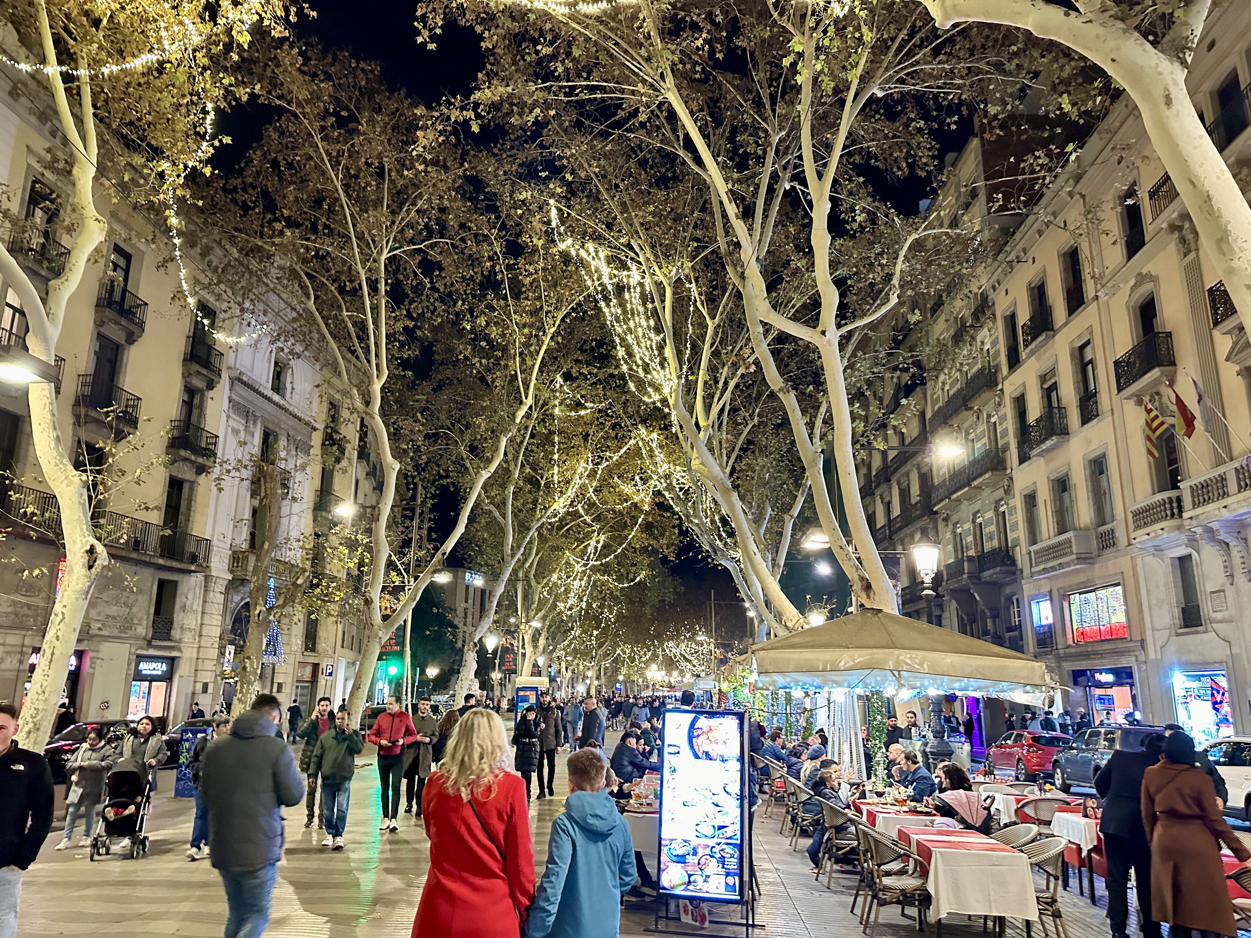 2023년 연말에 거닐던 람블라스 거리의 야경이 기억에 많이 남습니다.
