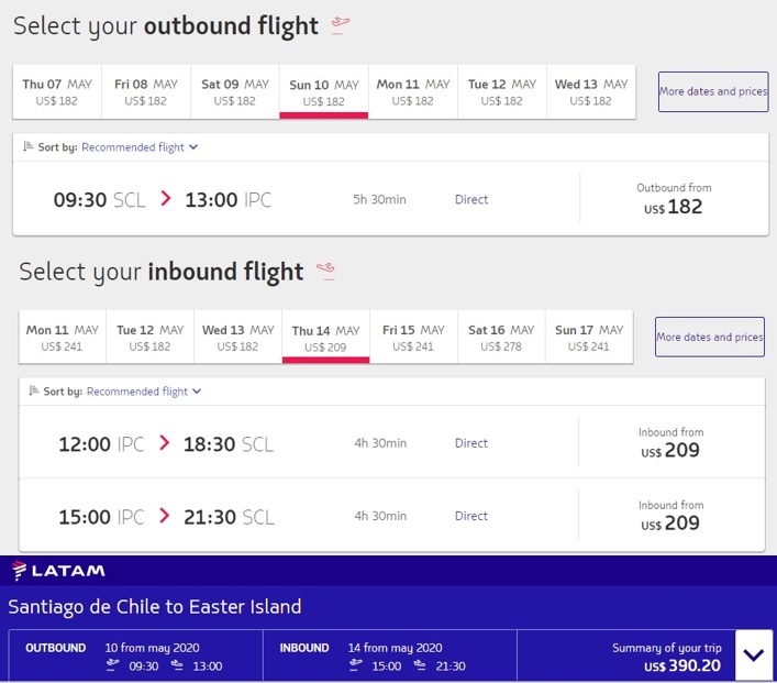 10 de mayo LA841 Santiago de Chile (A. Merino Benítez Intl.) 09:30 - Isla de Pascua (Mataveri Intl.) 13:00