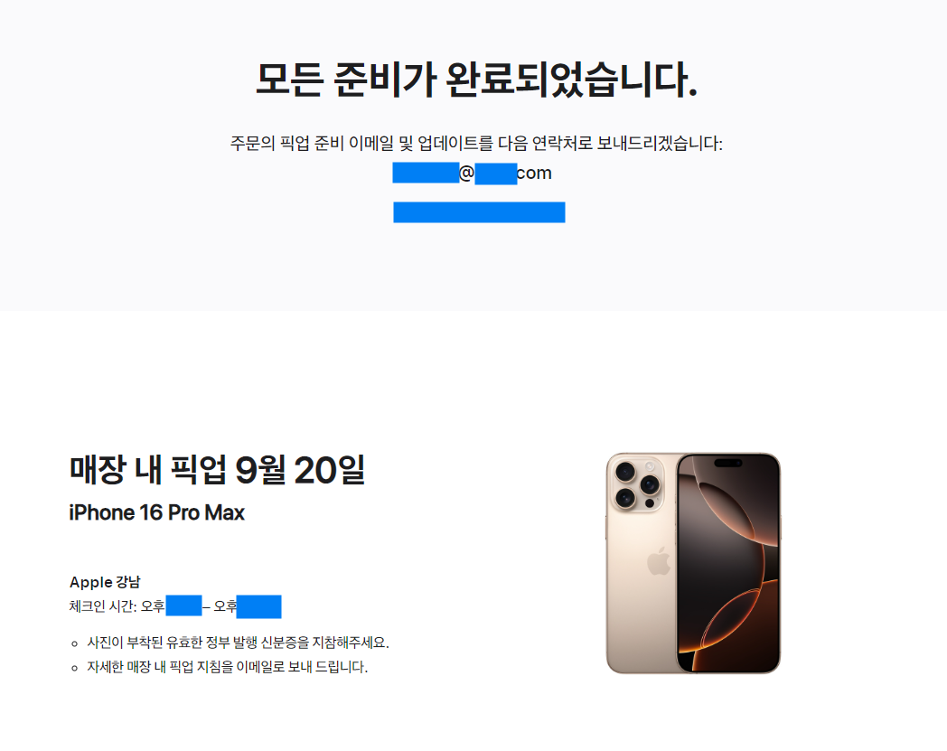 그래서 쿠팡 구매를 취소하고 애플 공홈에서 아이폰 16프로맥스를 구매하여 강남 애플스토어 픽업을 신청했습니다.