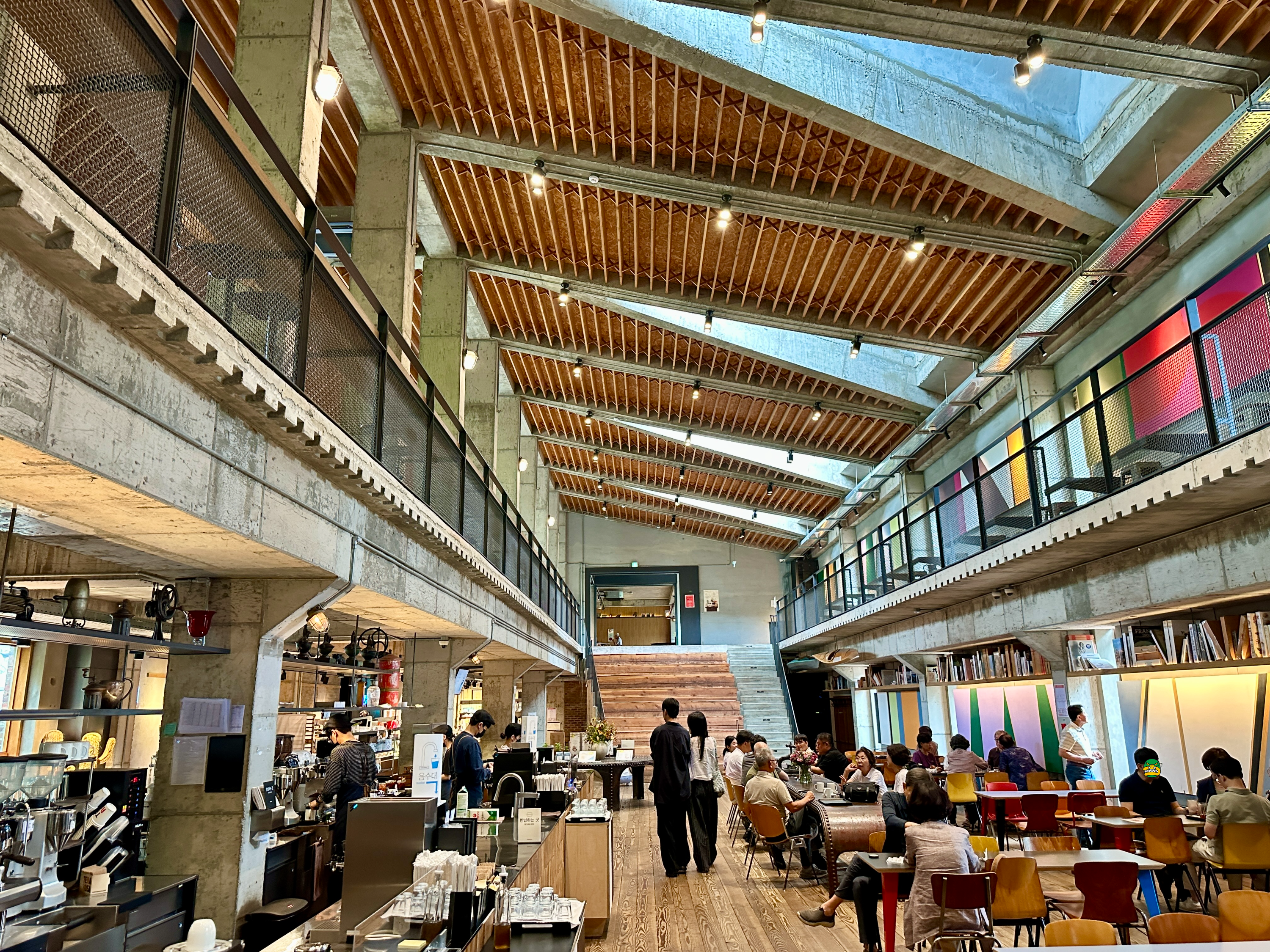 강릉 테라로사 본점 매장은 2층까지 공간이 있는데, 천장까지 높이가 높고 곳곳이 커피머신과 책으로 조화롭게 인테리어가 꾸며져 있어서 매우 감성적인 공간이었습니다.