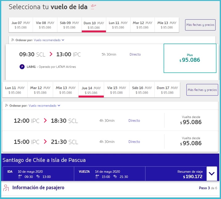 10 de mayo LA841 Santiago de Chile (A. Merino Benítez Intl.) 09:30 - Isla de Pascua (Mataveri Intl.) 13:00