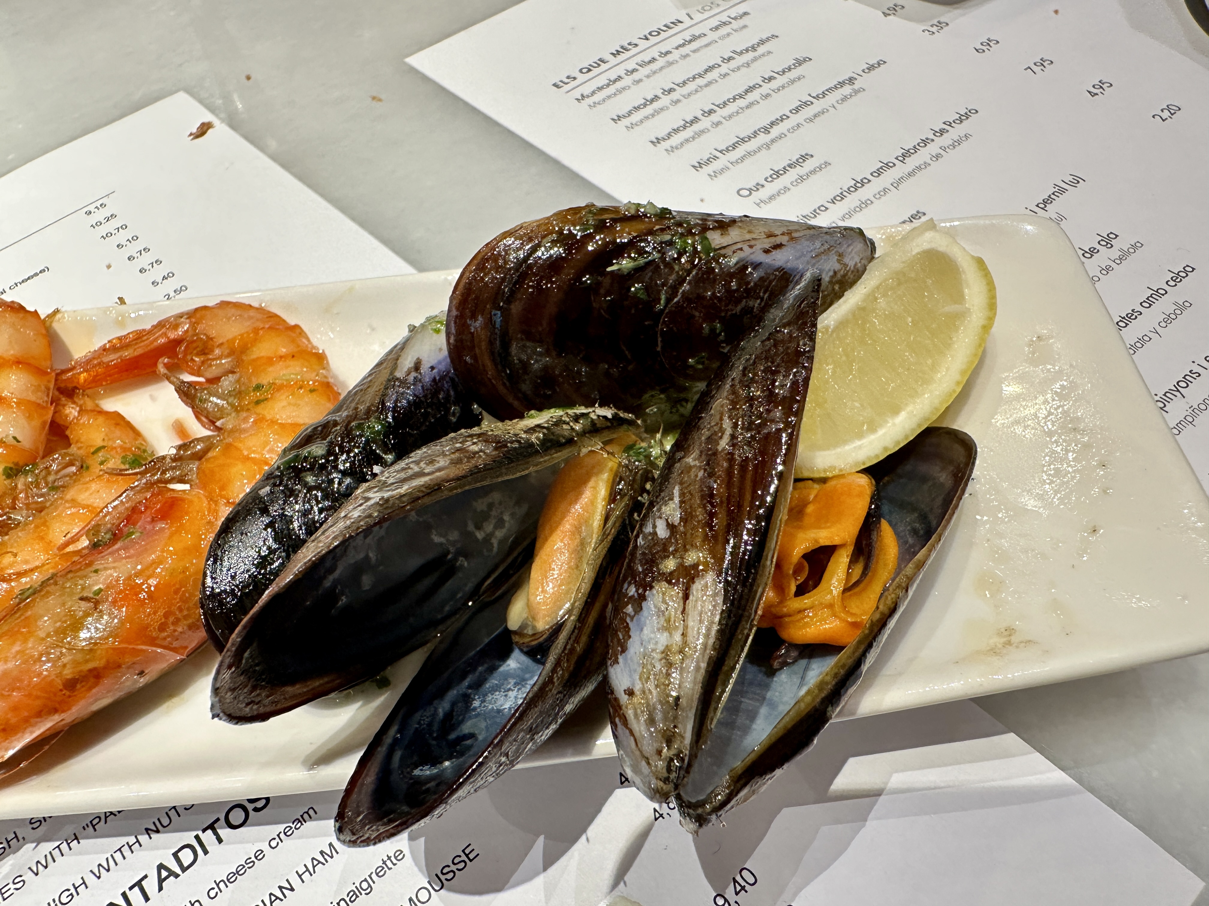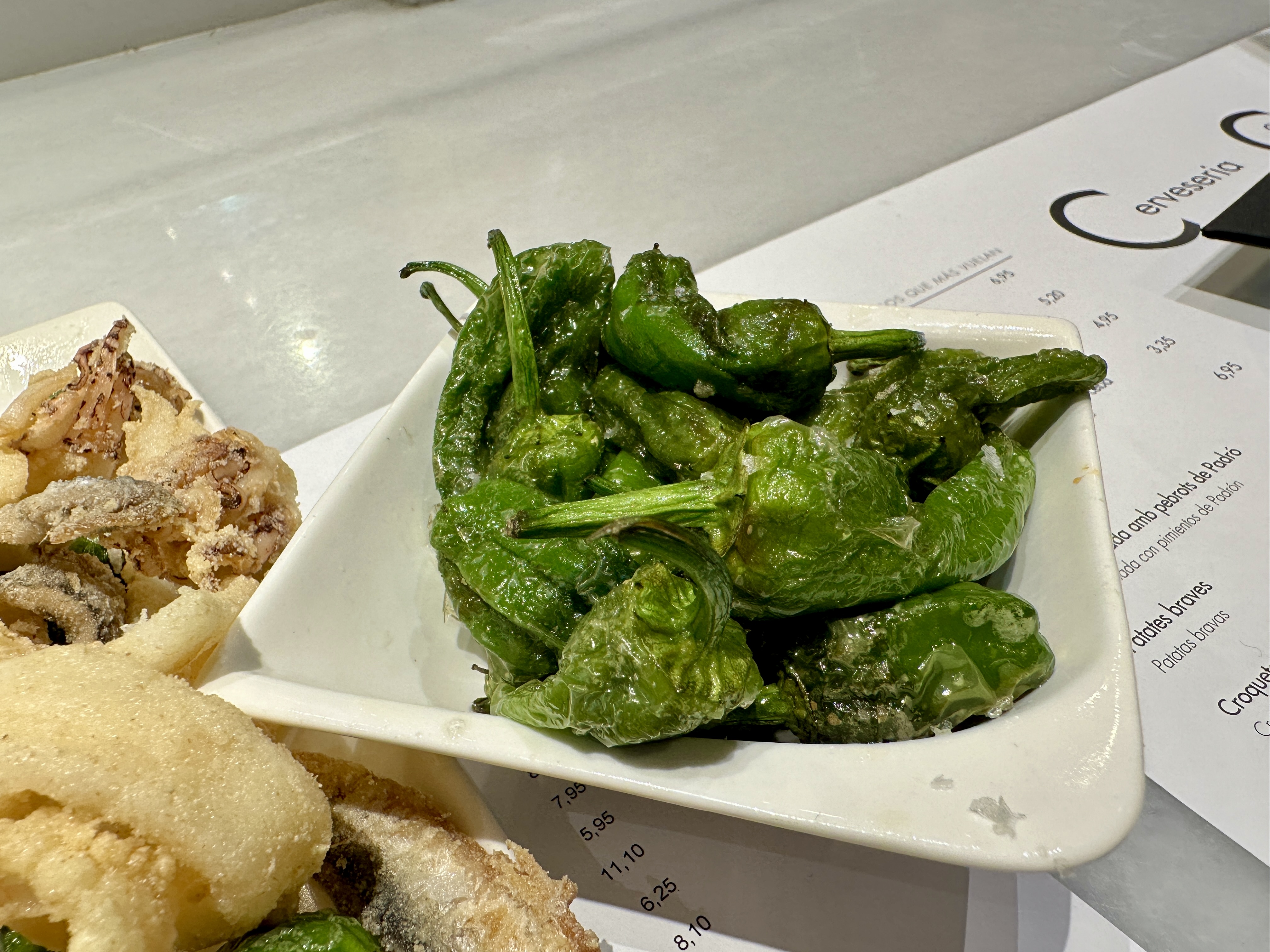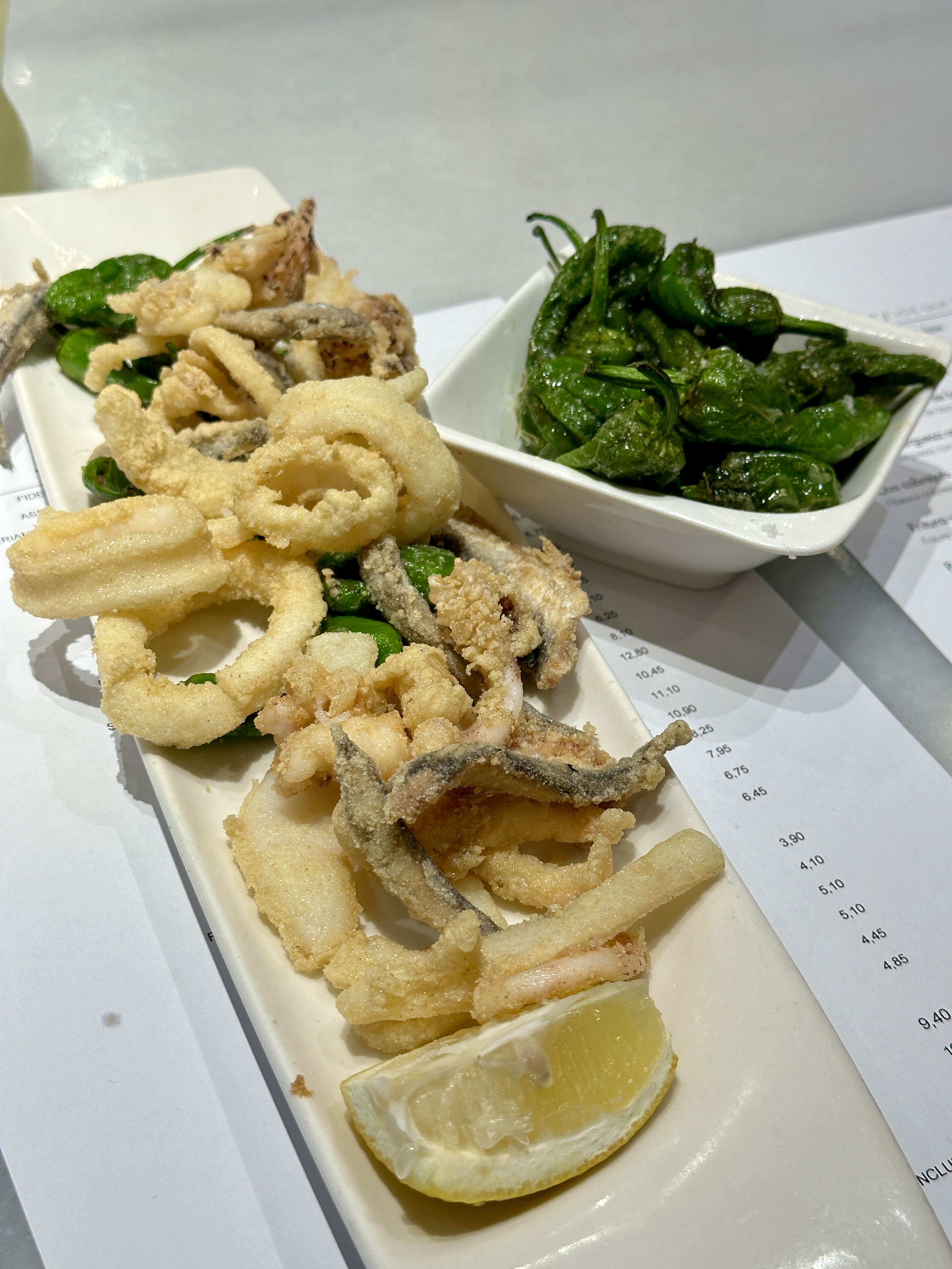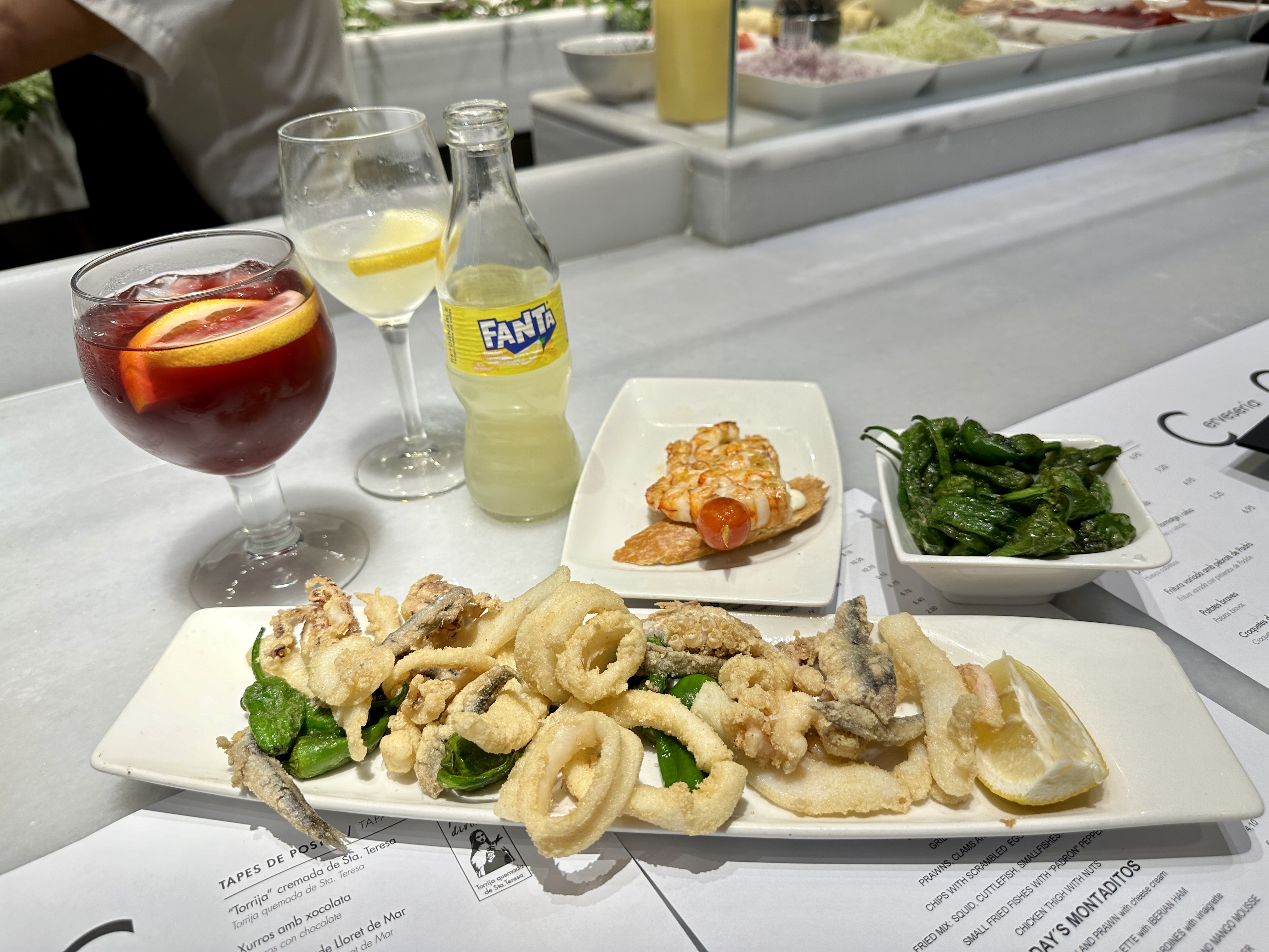메뉴로는 바르셀로나 해산물 요리부터 거의 모든 요리가 다 가능했고, 간단하게 맛볼 수 있는 가벼운 요리들도 많아서 와이프와 저는 간단한 요리들을 많이 시켜서 이것저것 맛보기로 했습니다.