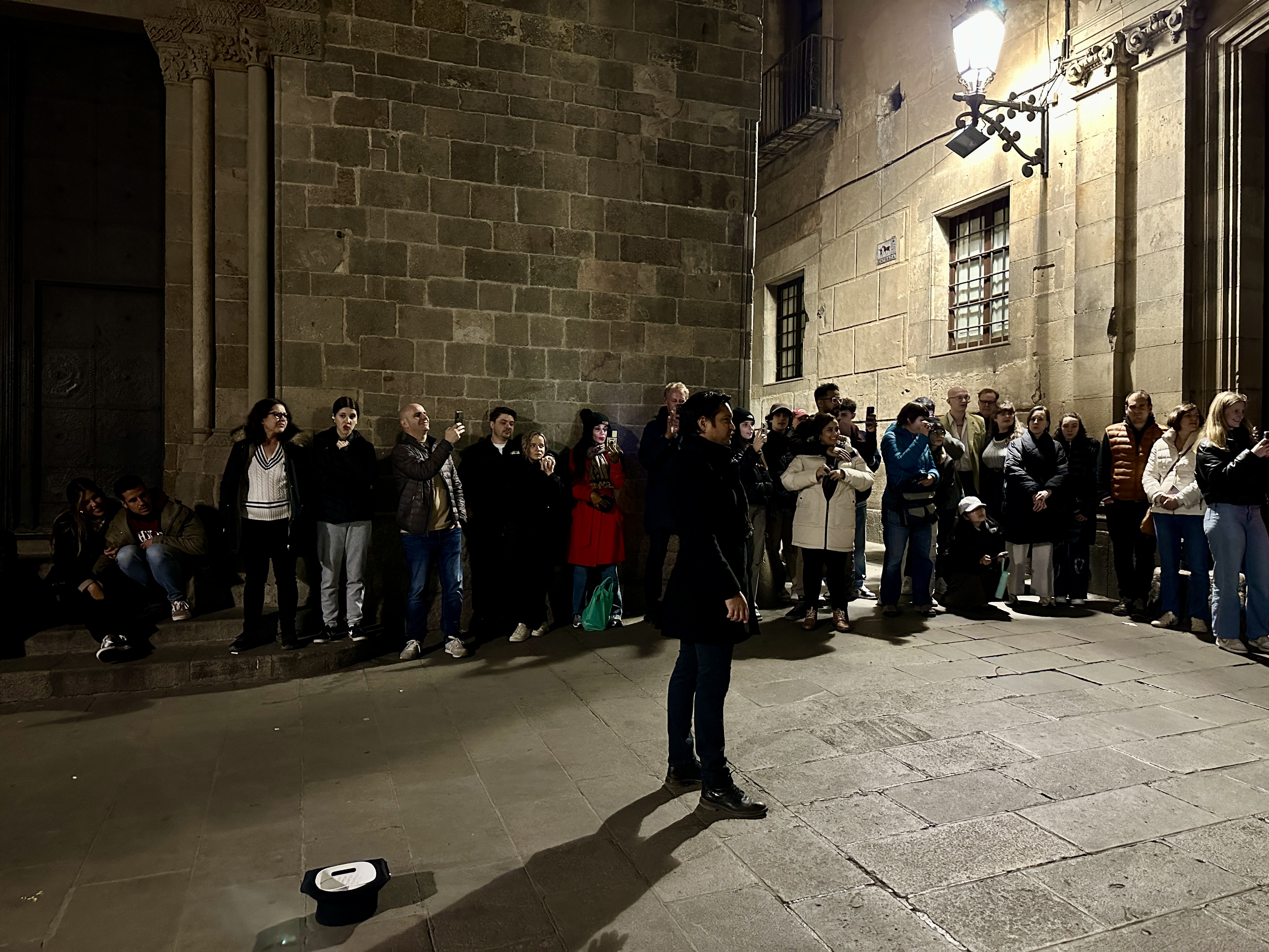 바르셀로나 대성당 앞 골목에서 거리 공연하는 남자를 볼 수 있었습니다.
