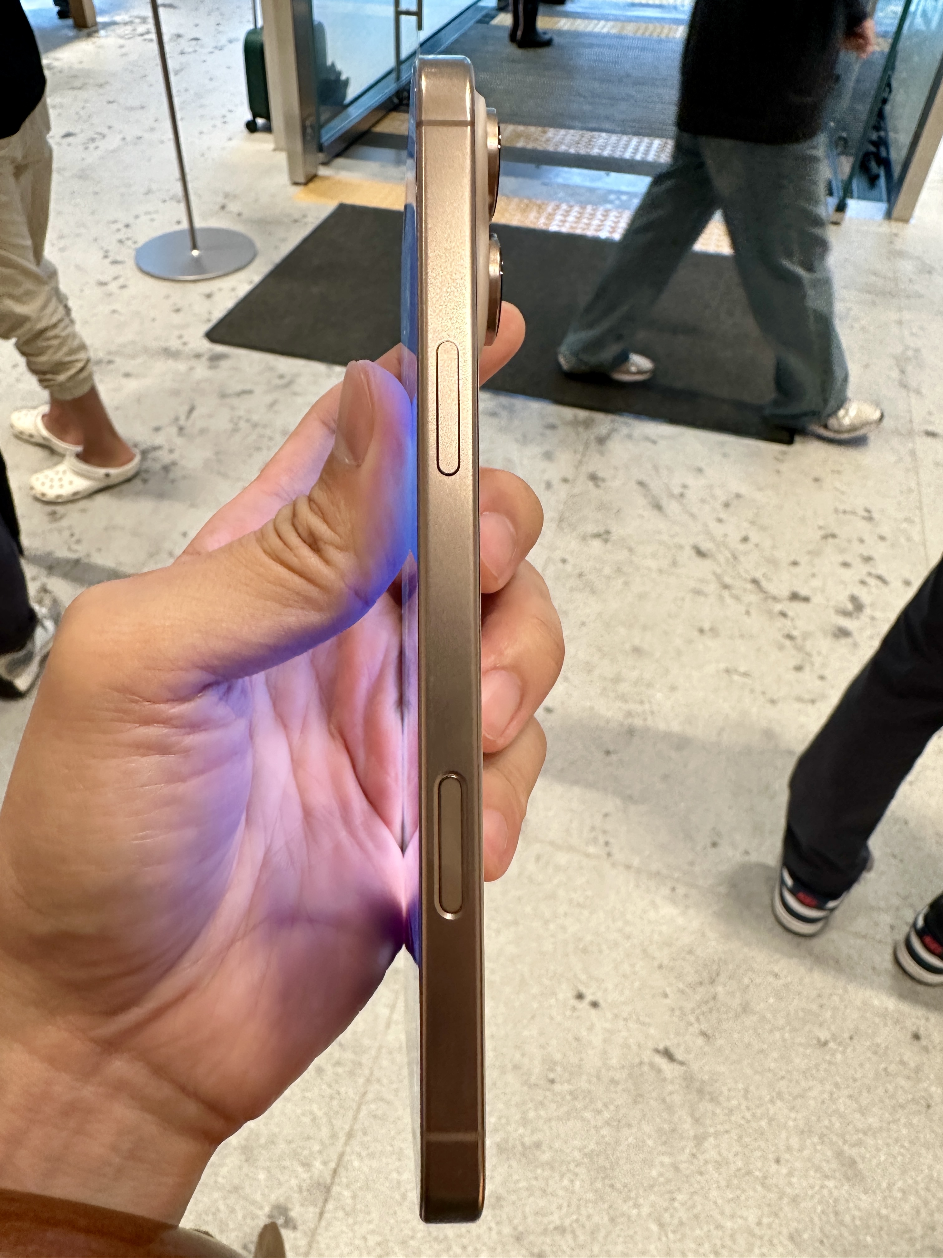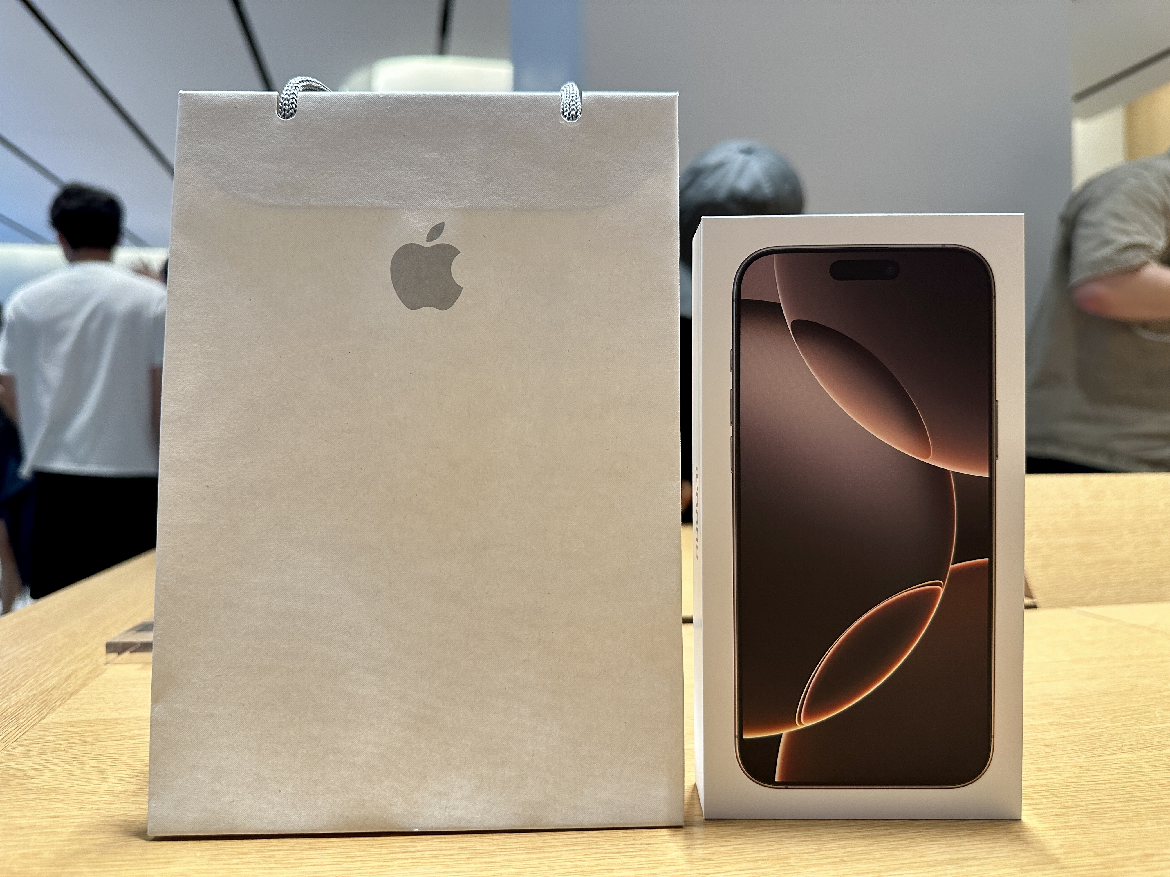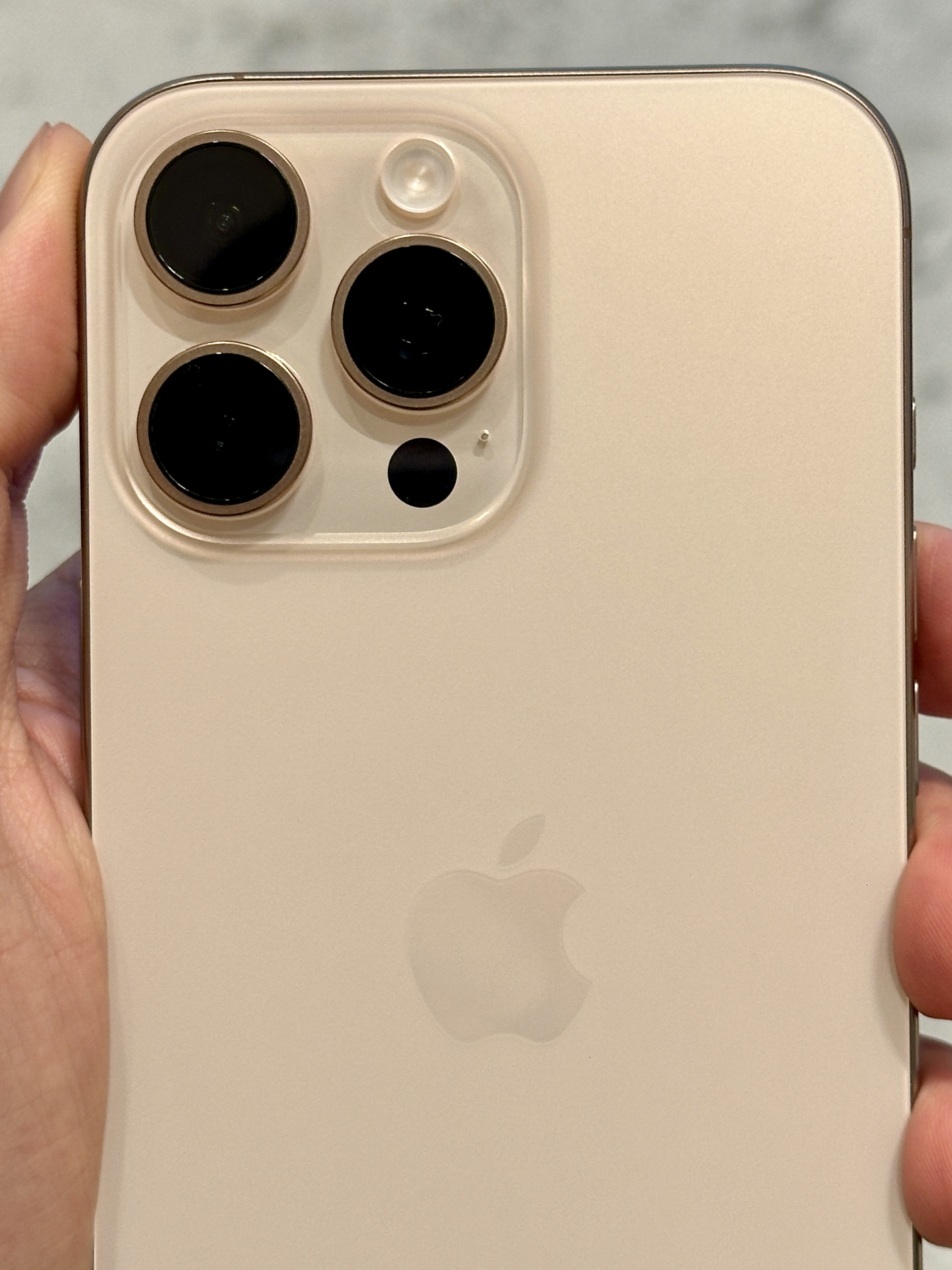 그 동안 실물을 구경해보라며 매장에 전시되어 있는 아이폰 16 프로맥스 데저트 색상을 주셔서 제 기계를 받기 전에 실물을 먼저 감상하고 있었는데, 예전 아이폰 6~8 시리즈때의 로즈골드 느낌이 나지만 약간 덜 화사한 살구색 느낌이 나는 데저트 색상이었습니다.