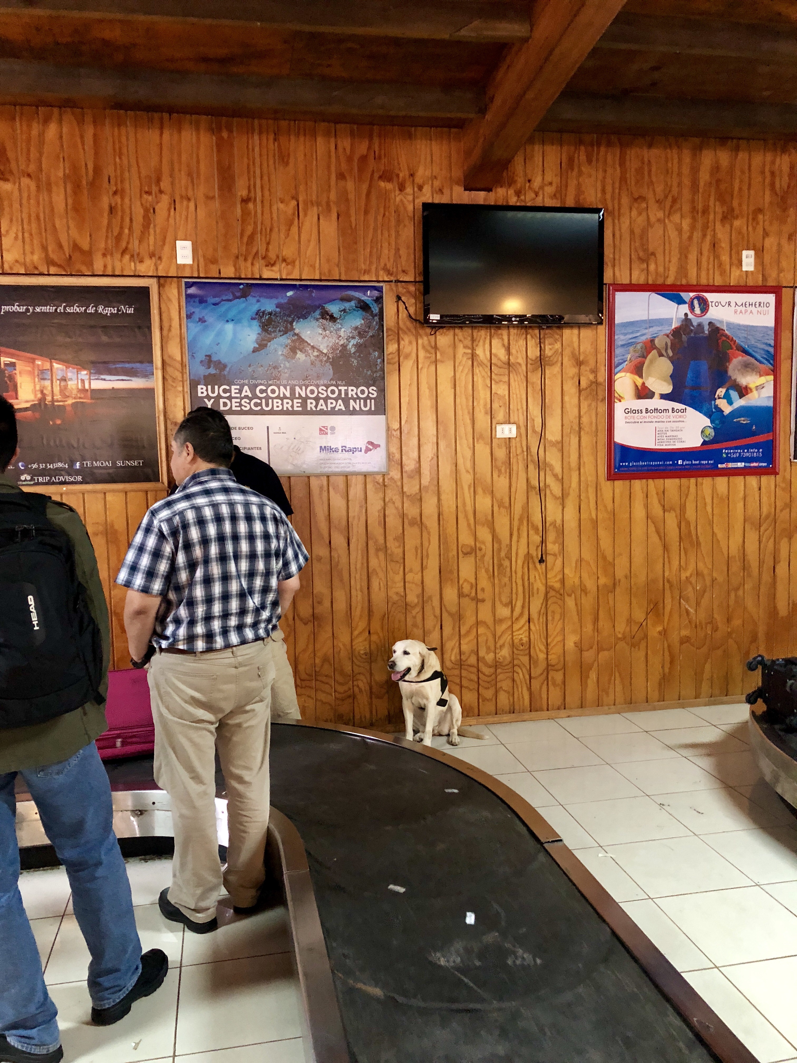 이스터섬의 마타베리 공항의 입국장에서 업무를 하고 있는 리트리버 강아지가 너무나 사랑스러워서