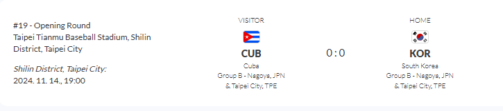두번째 경기 - 11월 14일 19:00분 대한민국 vs 쿠바 / 타이페이 티안무 야구 스타디움
