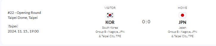 세번째 경기 - 11월 15일 19:00분 대한민국 vs 일본 / 타이페이돔