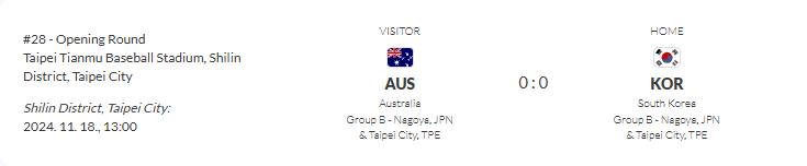 다섯번째 경기 - 11월 18일 13:00분 대한민국 vs 호주 / 타이페이 티안무 야구 스타디움