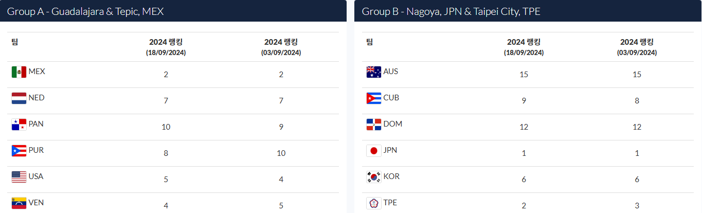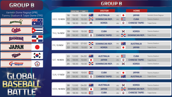대한민국은 호주, 쿠바, 도미니카공화국, 일본, 대만과 함께 그룹 B에 편성이 되었습니다.