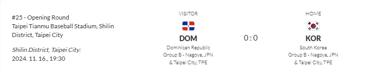 네번째 경기 - 11월 16일 19:30분 대한민국 vs 도미니카공화국 / 타이페이 티안무 야구 스타디움