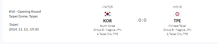 첫번째 경기 - 11월 13일 19:30분 대한민국 vs 대만 / 타이페이 돔