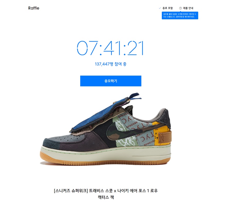 지금은 트래비스 스콧 x 나이키 에어 포스 1 로우 캑터스 잭 신발의 판매가 진행되고 있어 나도 응모했다.