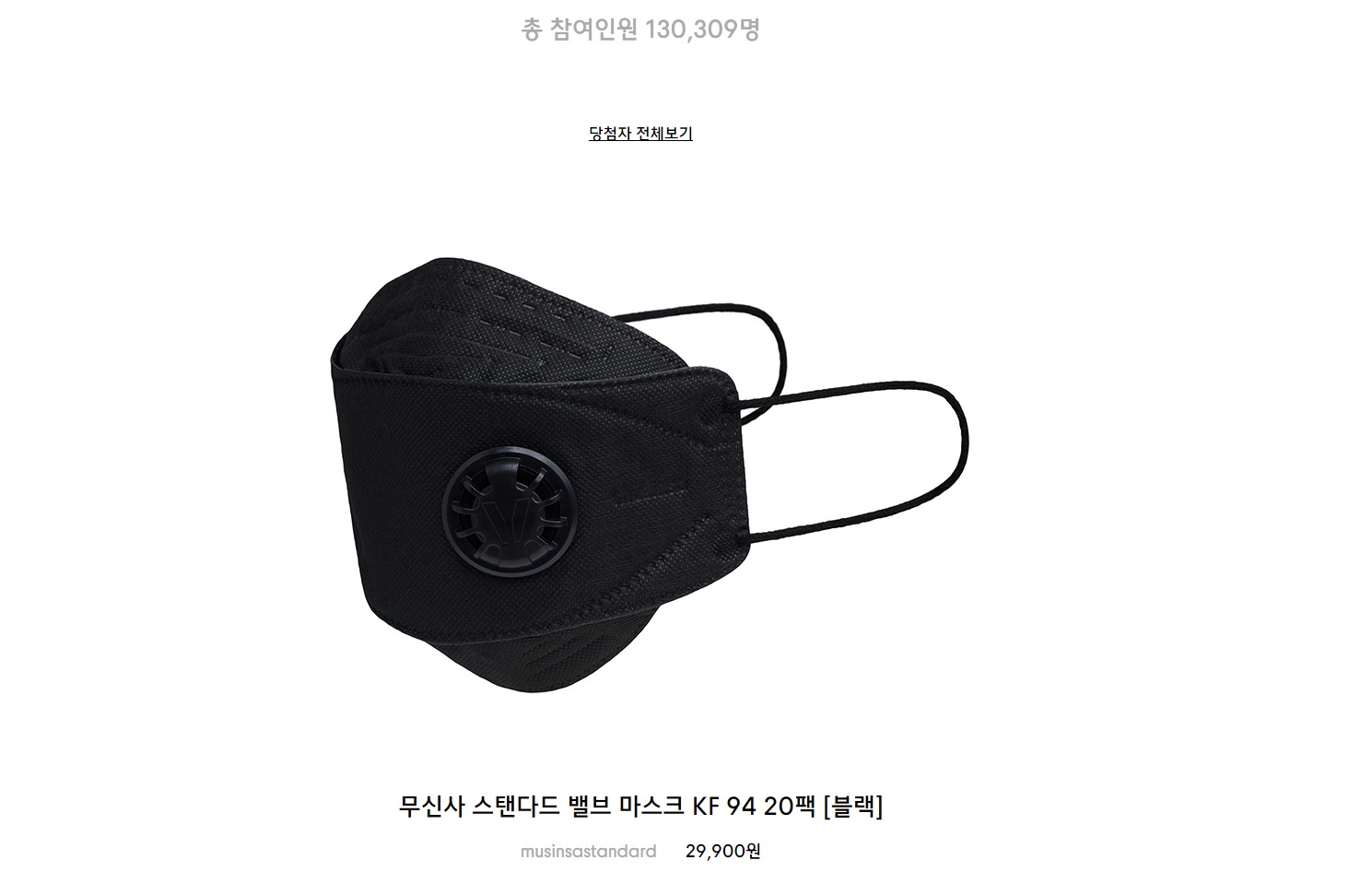 APP으로만 참여가 가능하며 이전에 무신사 스탠다드 밸브 마스크 KF94 20매를 29,900원에 판매하여
