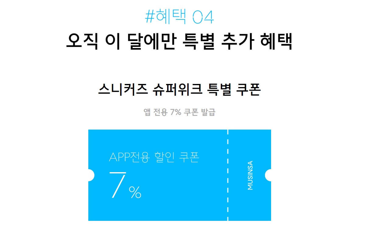 스니커즈 슈퍼위크 특별 쿠폰으로 앱 전용 7% 쿠폰을 지급한다.