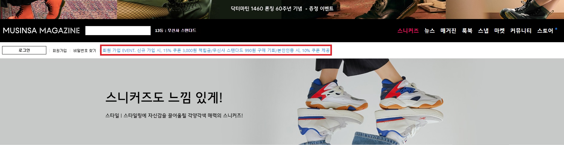 우선 무신사 홈페이지 메인 화면에 들어가면 상단에 회원가입 EVENT가 나와있다.