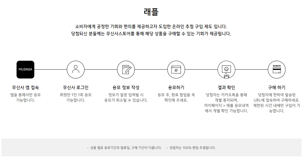무신사 래플은 타임세일의 하나로 응모를 통해 당첨된 고객에 한하여 구매할 수 있는 상품이다.