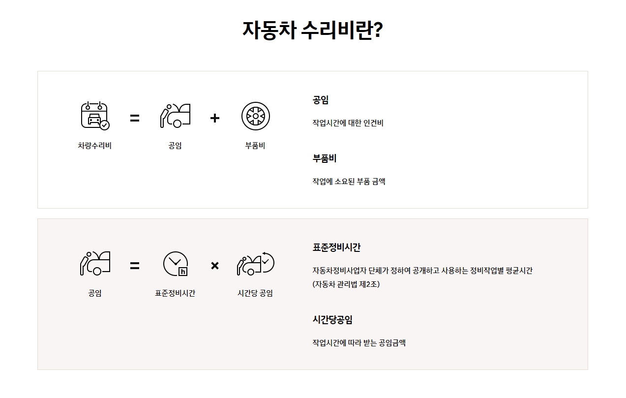 차량수리비 = 공임(작업시간에 대한 인건비) + 부품비(작업에 소요된 부품 금액)