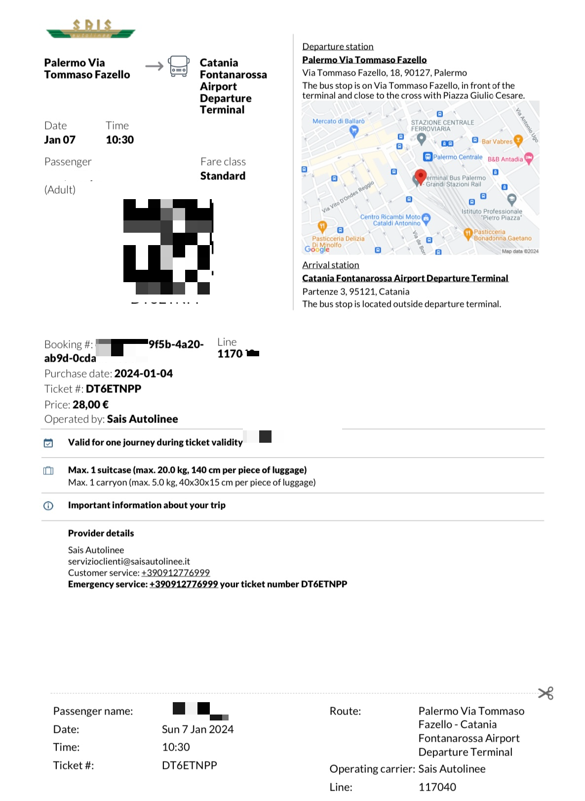 저희는 미리 플랫폼을 통해 팔레르모에서 카타니아로 가는 버스티켓을 구매했고, 요금은 인당 14유로에 2명해서 28유로였습니다. 버스요금에는 항공권처럼 수하물 규정이 적혀있었습니다.