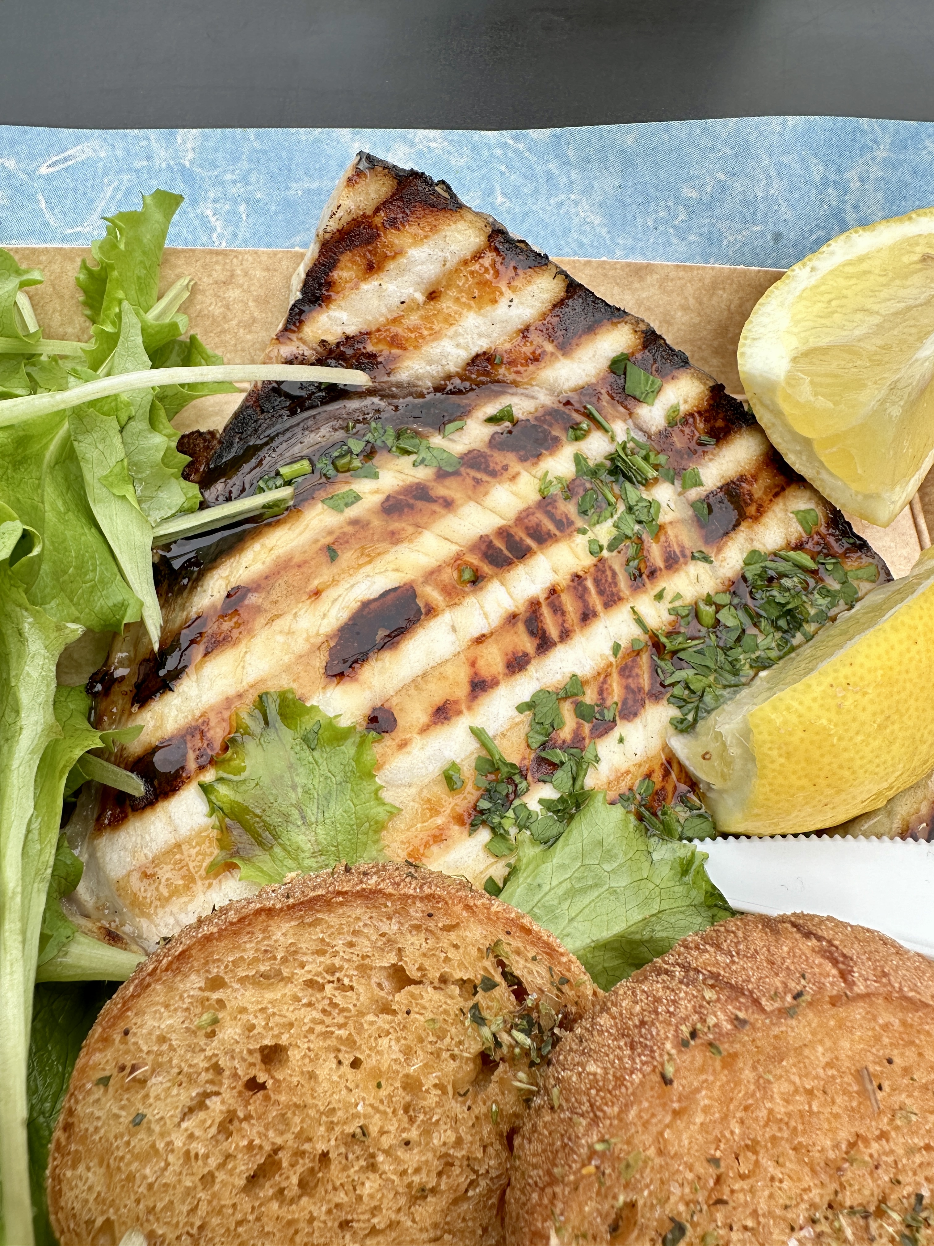 지중해의 올리브와 여러가지 채소 그리고 레몬과 함께 먹는 황새치 구이는 정말 별미였습니다.