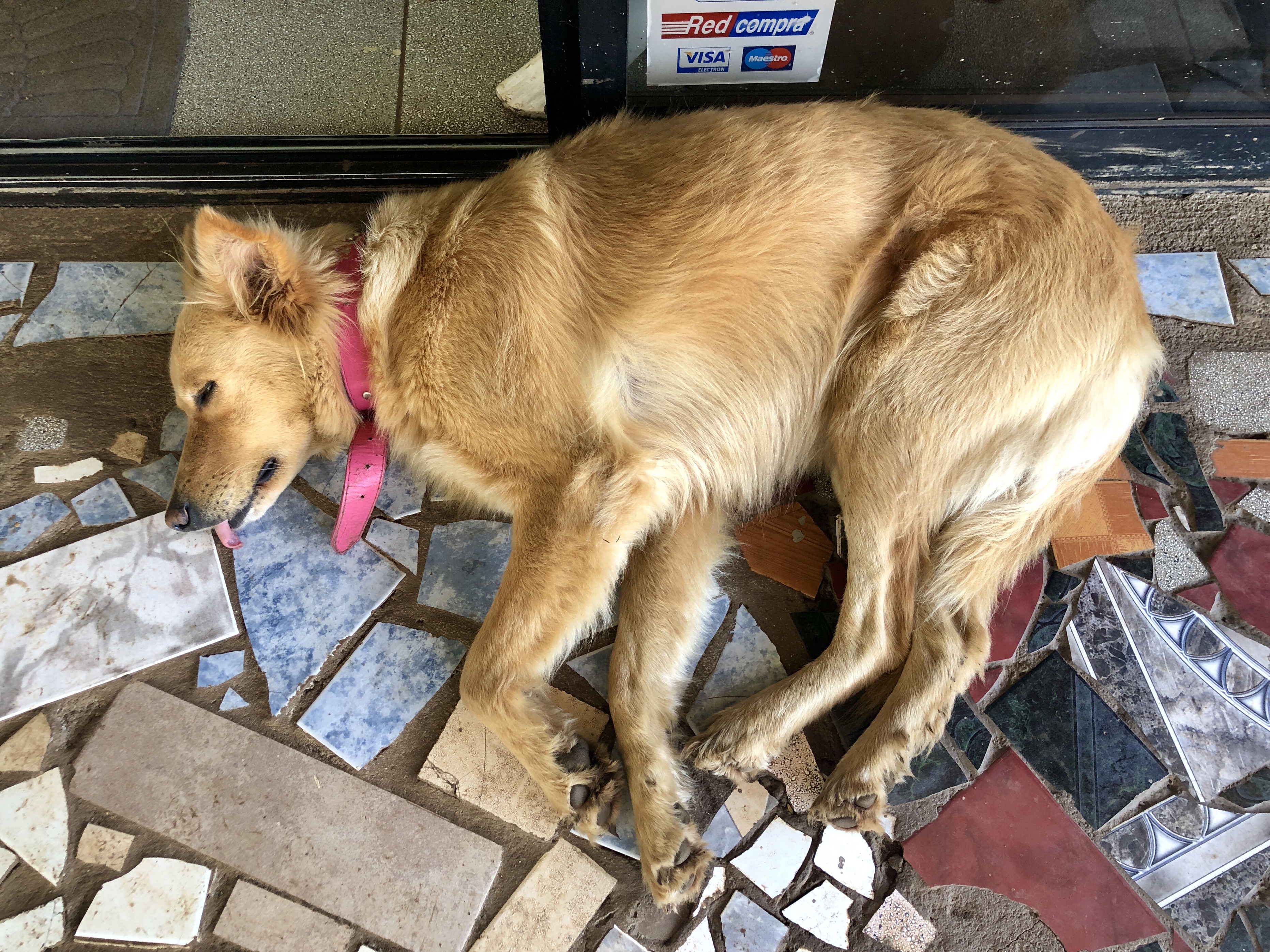 가게 입구를 막고 강아지가 누워자고 있었는데, 더웟는지 혀를 내밀고 잔다.