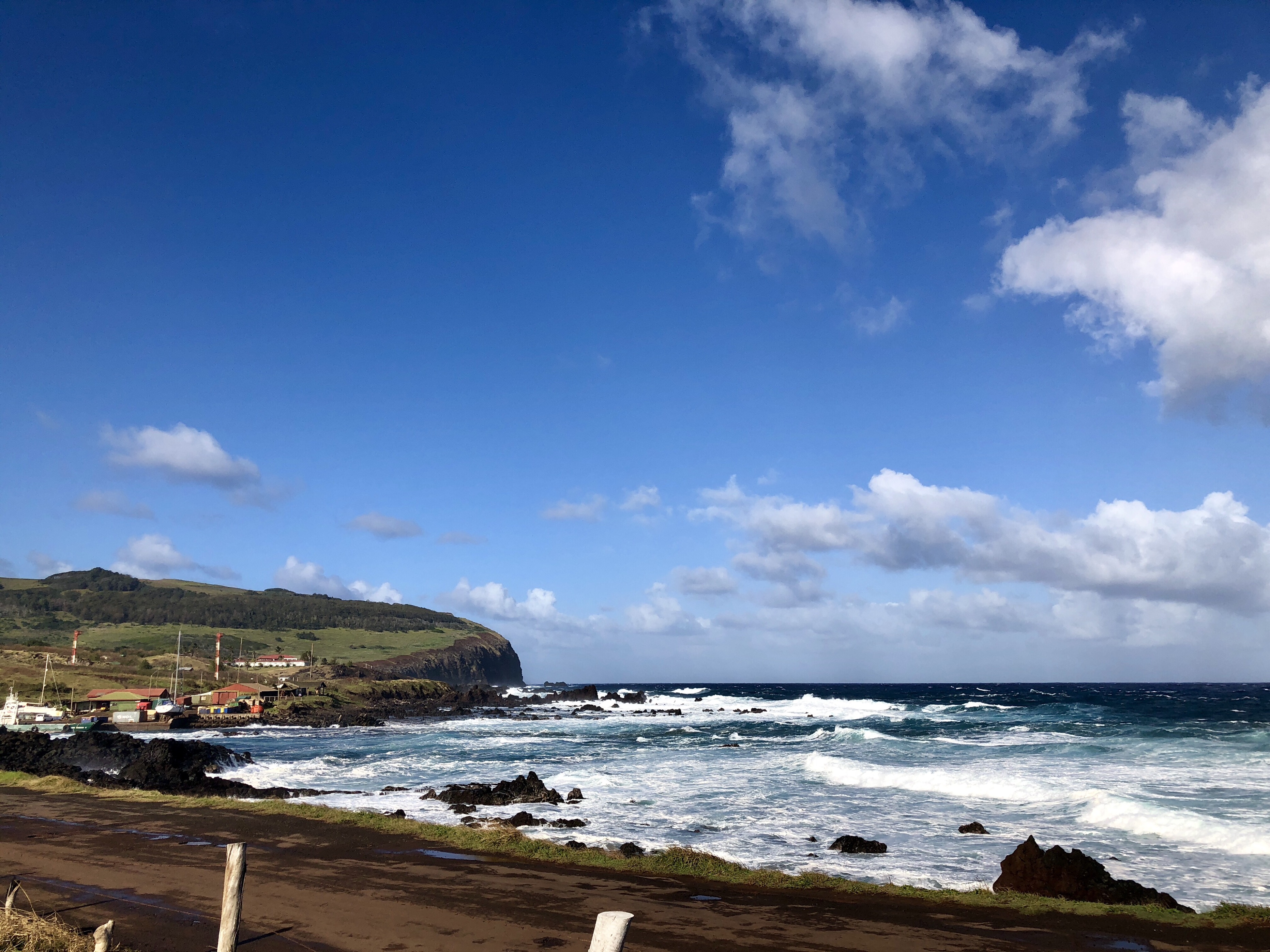 바로 앞에 남태평양의 바다가 펼쳐진 숙소에서 꿈같은 하룻밤을 보내고 이스터섬에서 2일차 아침.