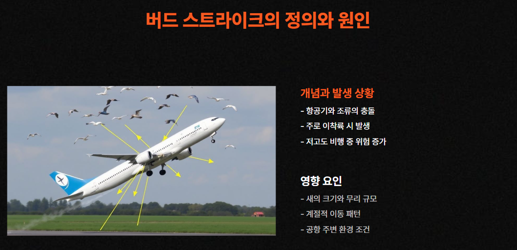 새의 크기나 무리에 따라 충돌의 강도와 영향이 달라지며, 가끔 대형 새와 부딪힐 때는 엔진에 심각한 손상을 입히기도 합니다.