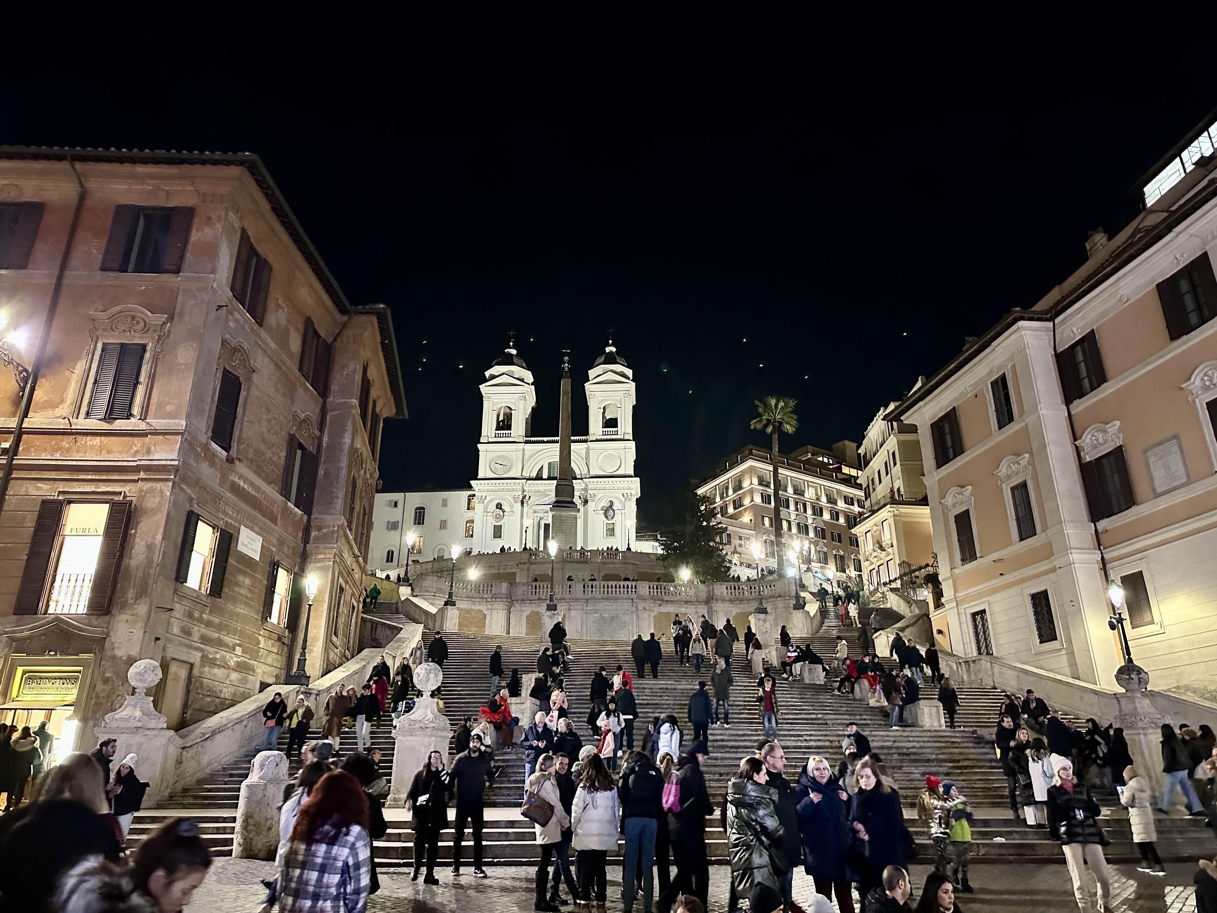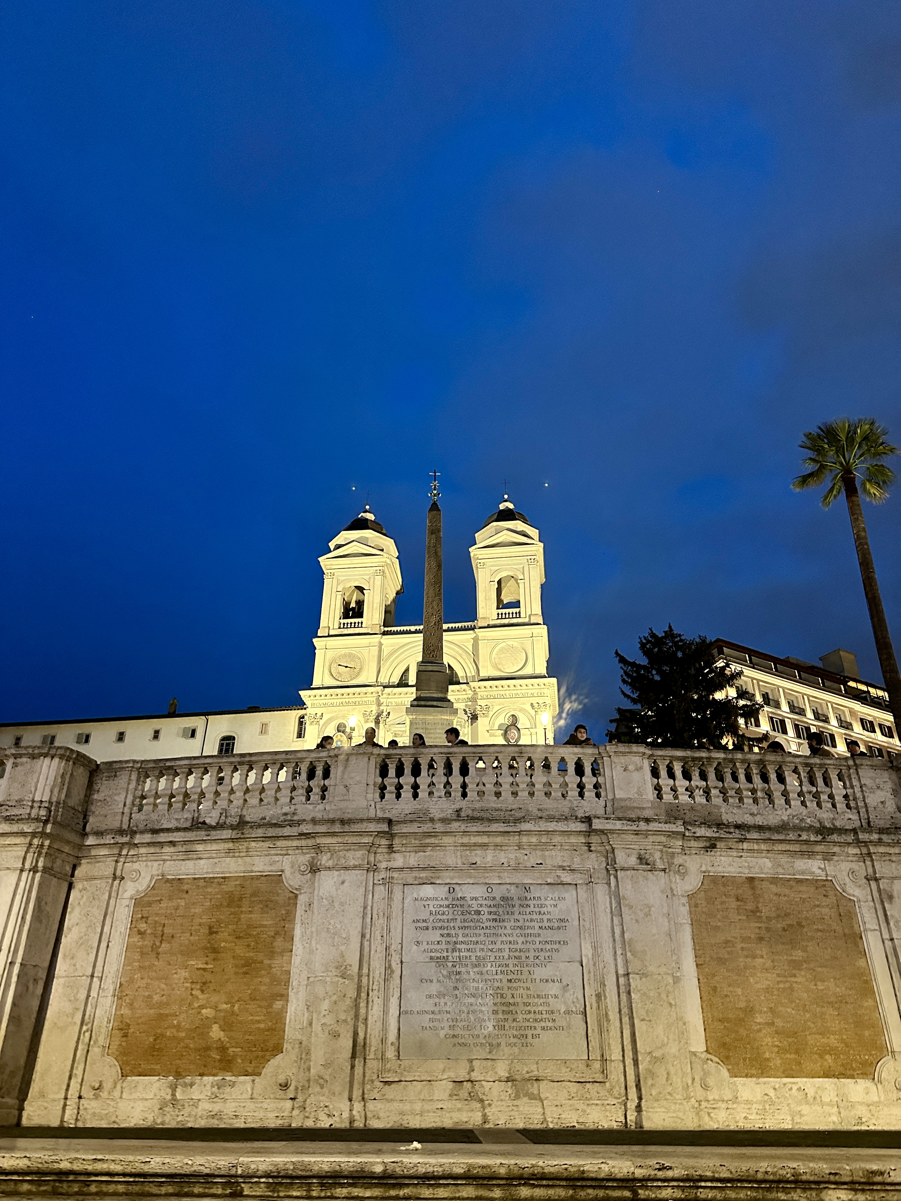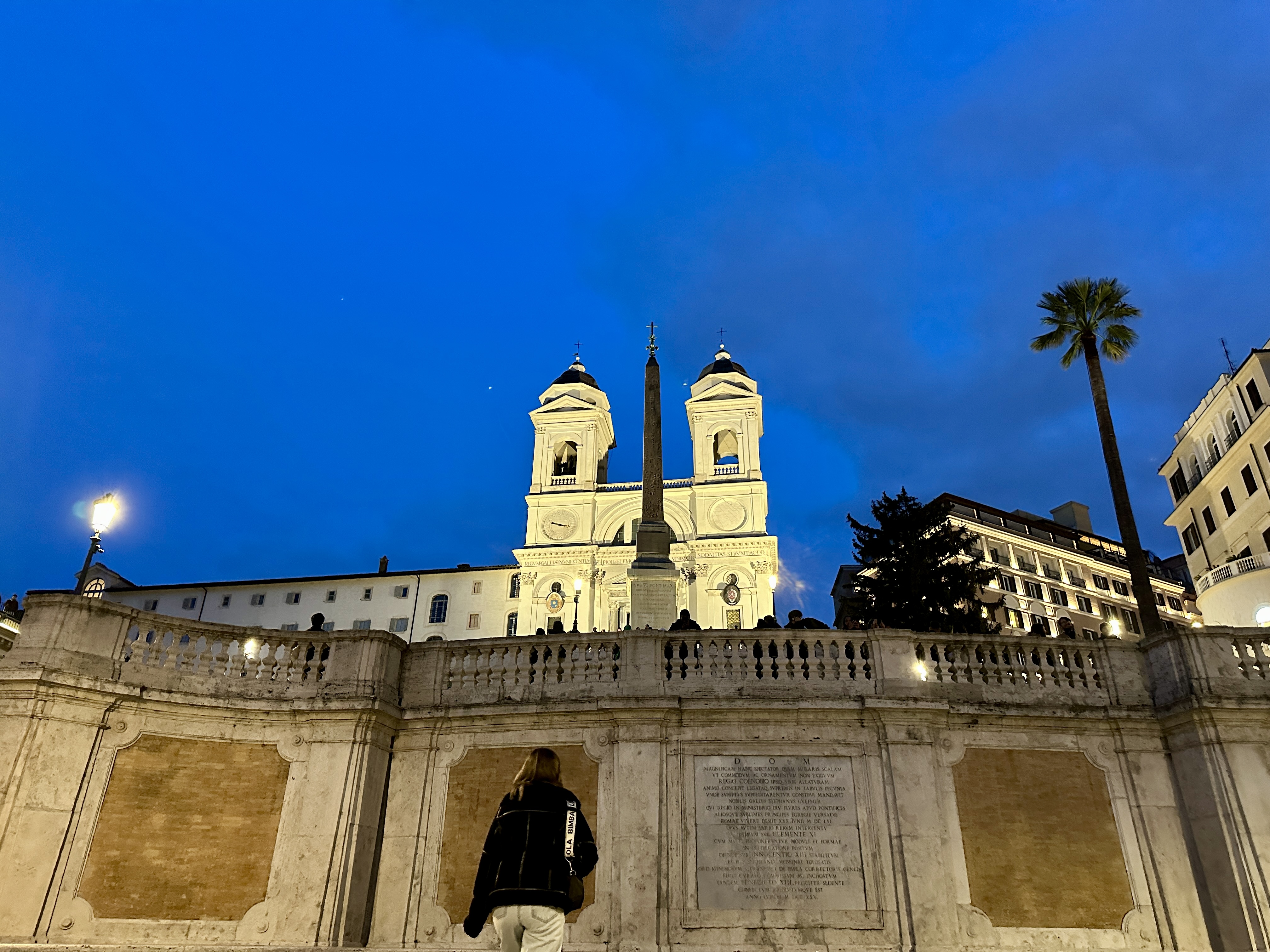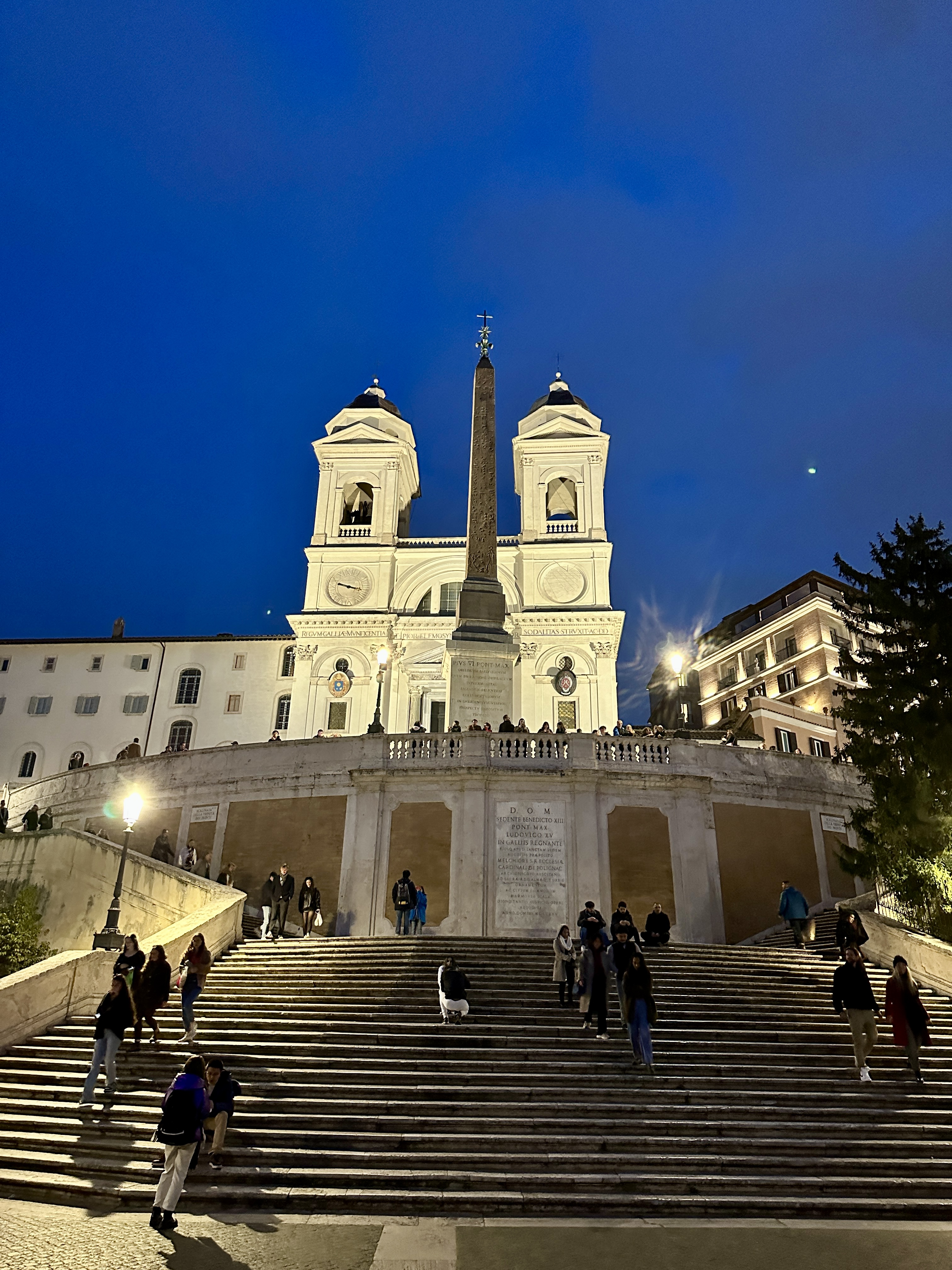 스페인광장의 스페인 계단을 바라보면 뒤로는 콘도티 거리가 펼쳐지고 앞으로는 스페인 계단과 언덕위의 트리니타 데이 몬티 성당이 아름다운 스페인 광장의 야경을 완성시키고 있습니다.