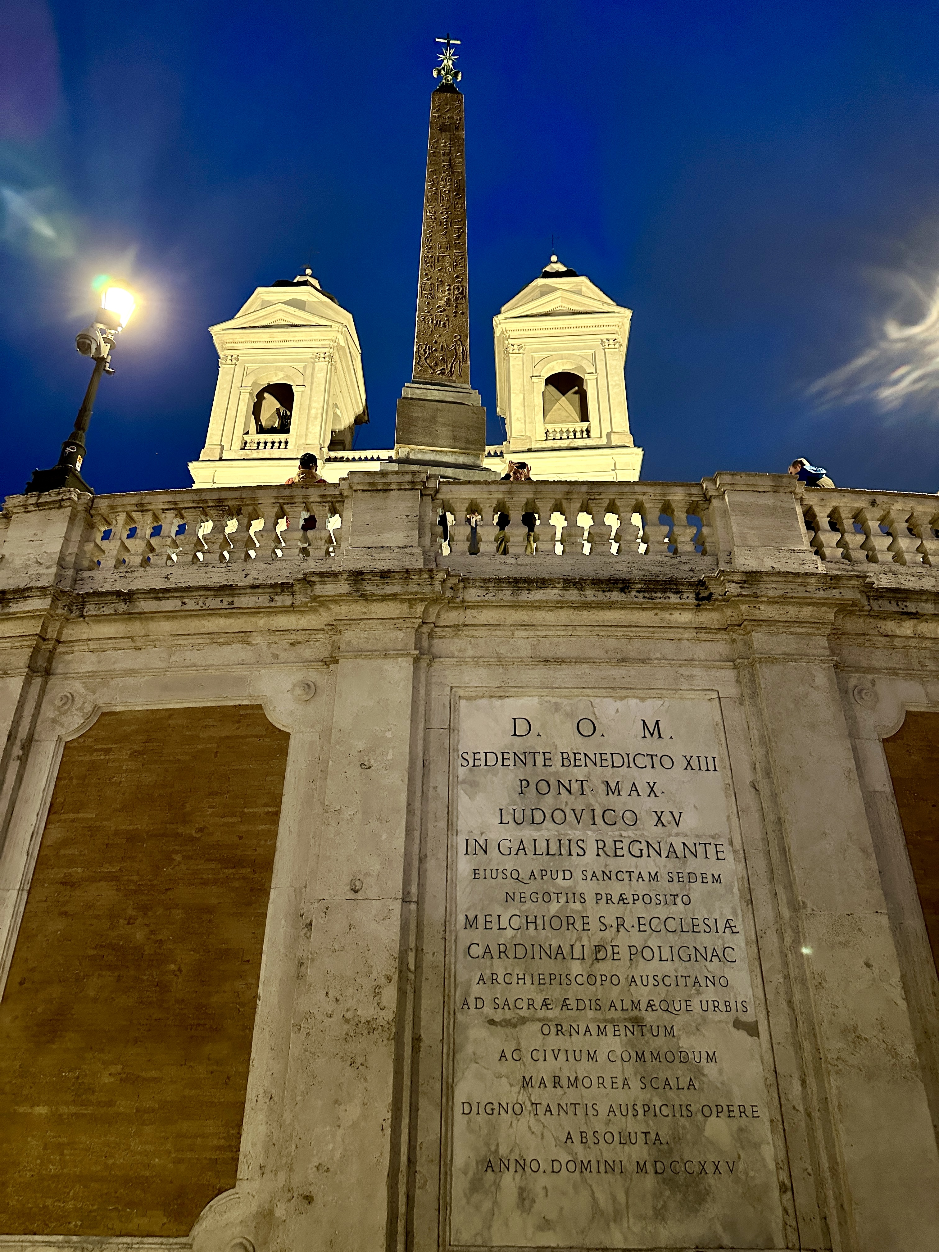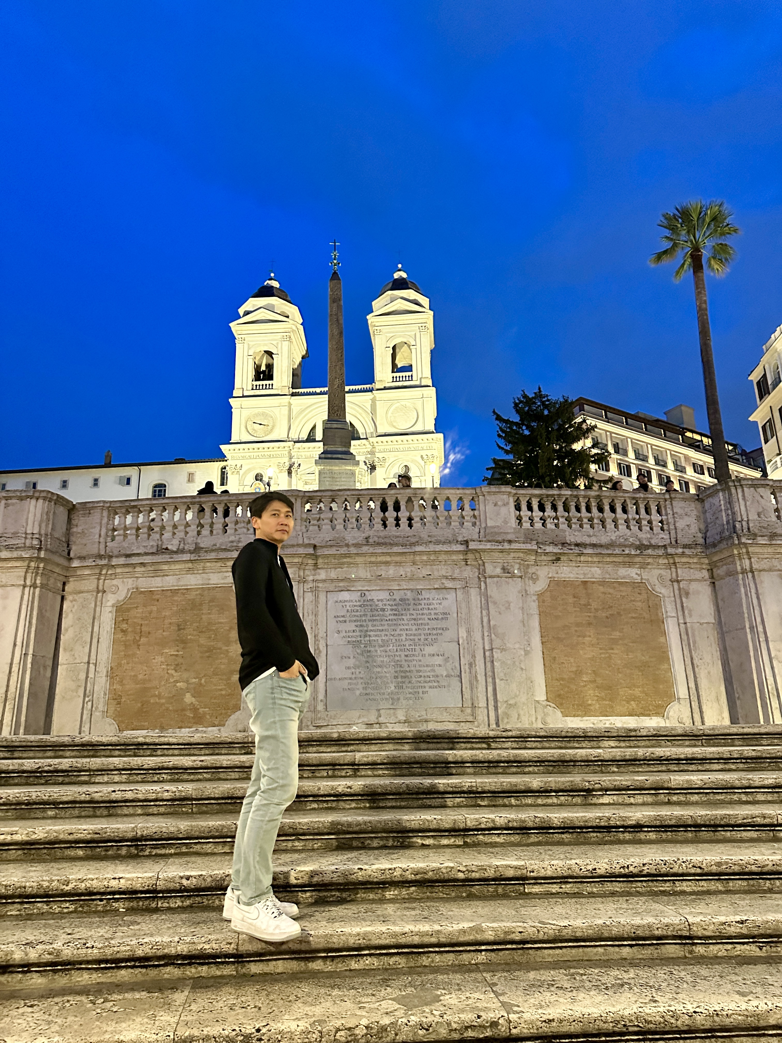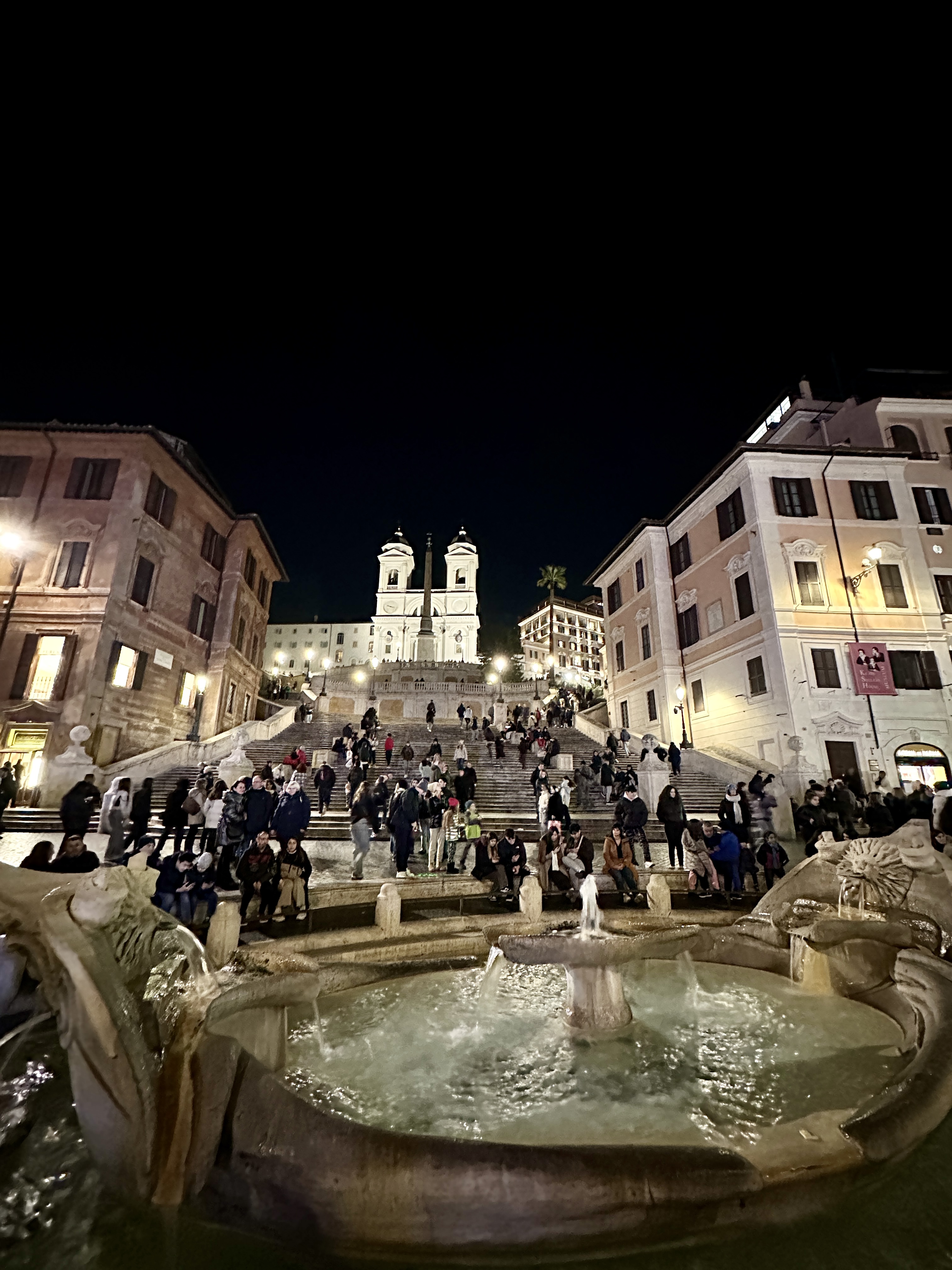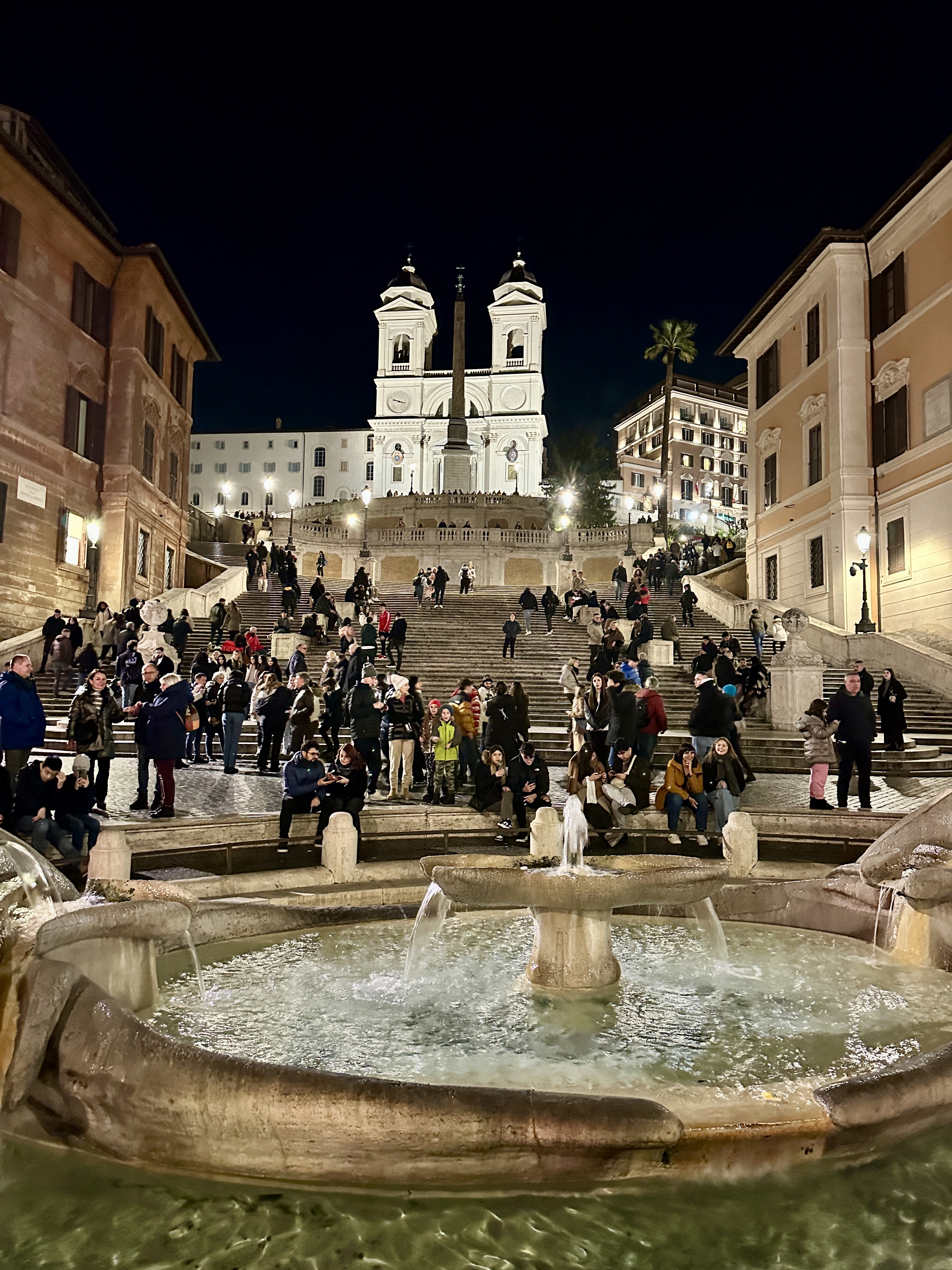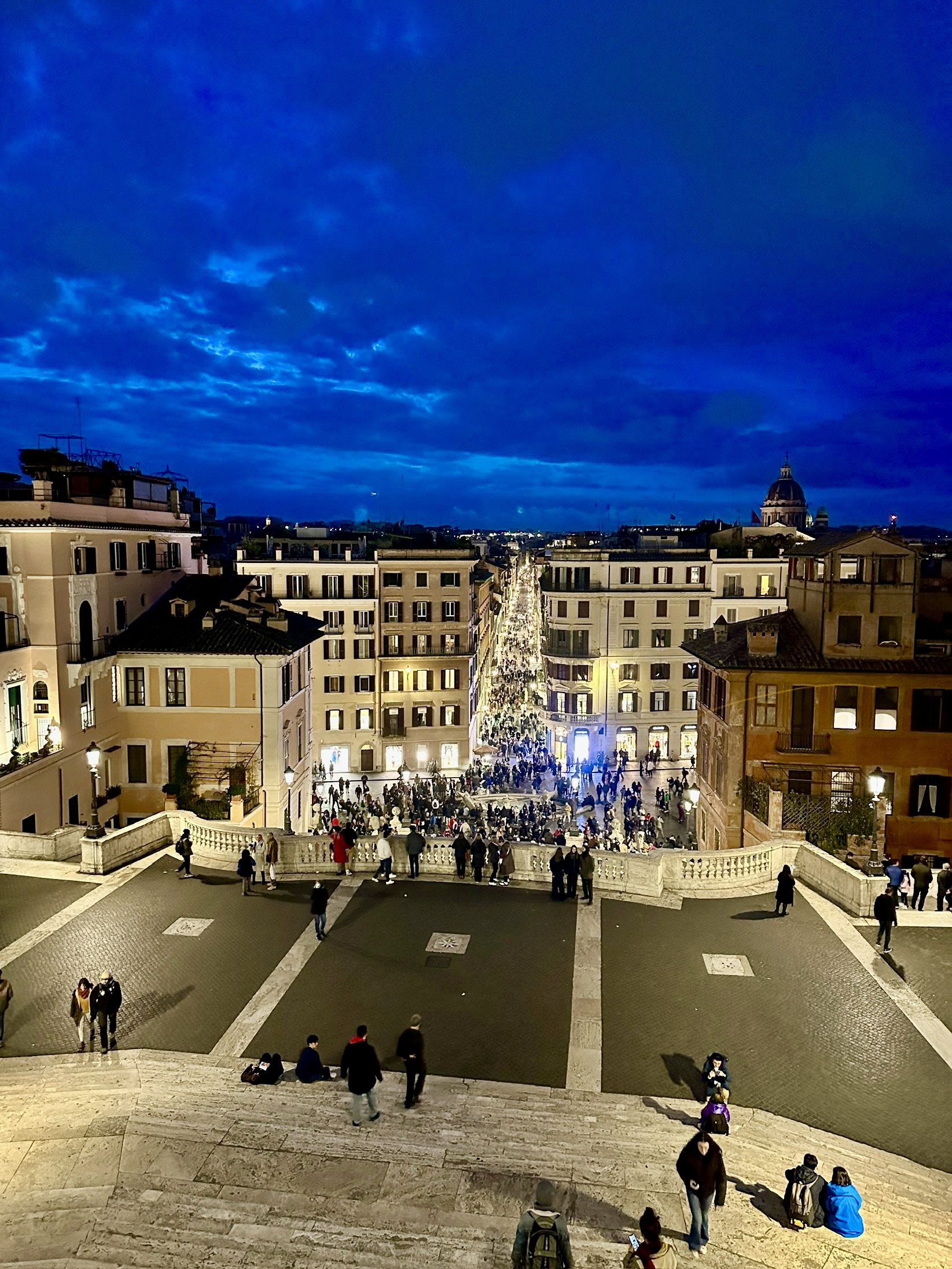 스페인광장의 스페인 계단을 바라보면 뒤로는 콘도티 거리가 펼쳐지고 앞으로는 스페인 계단과 언덕위의 트리니타 데이 몬티 성당이 아름다운 스페인 광장의 야경을 완성시키고 있습니다.