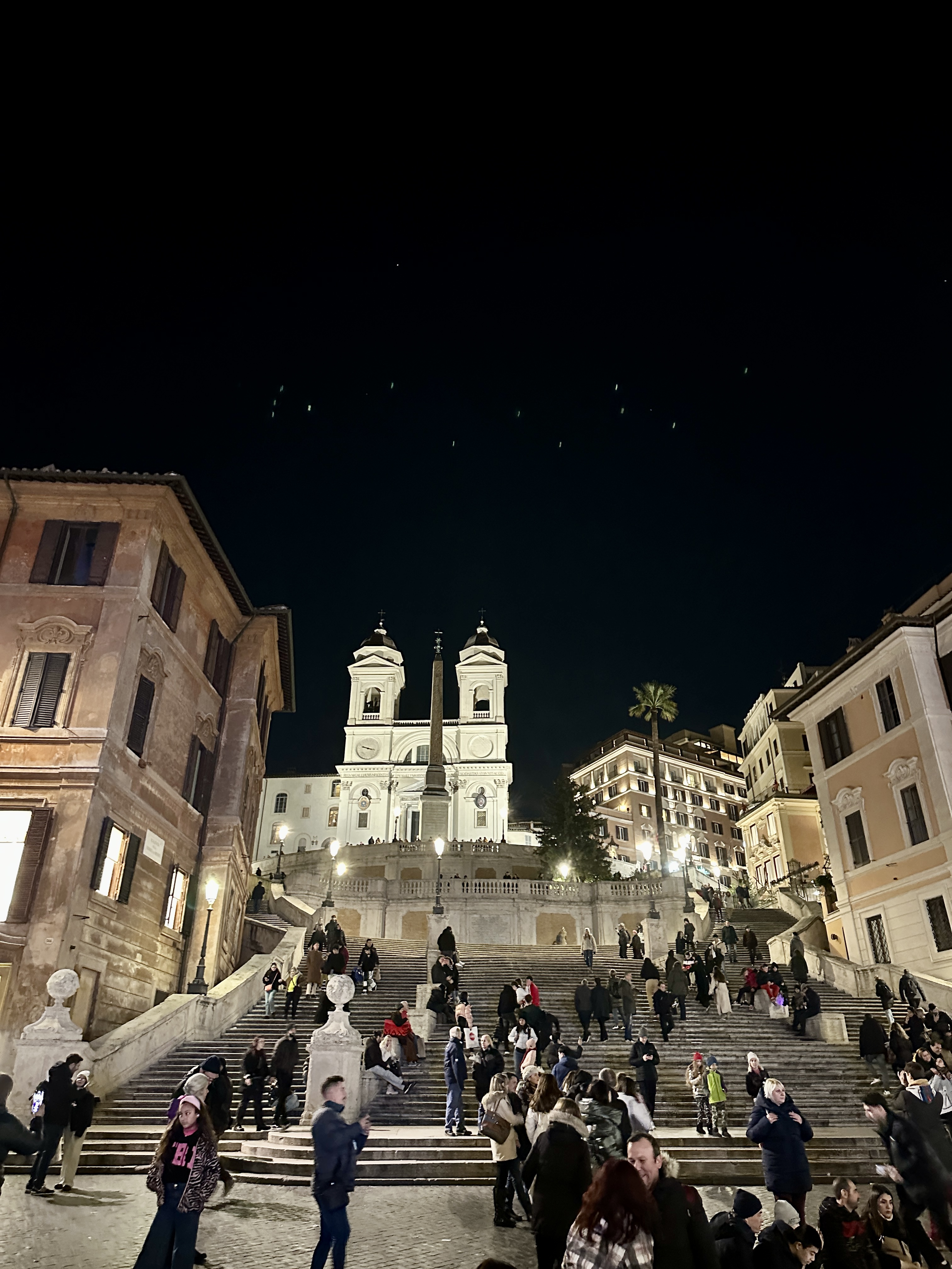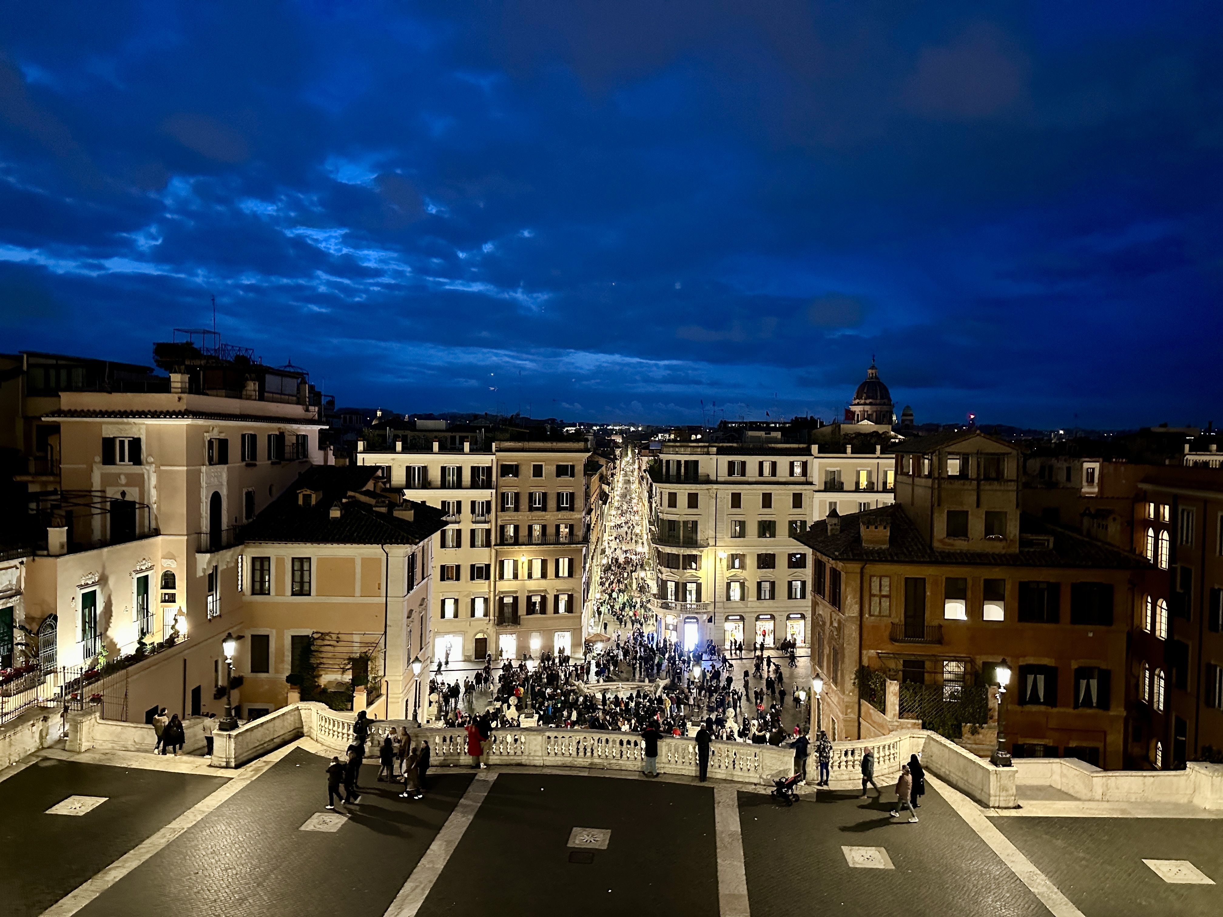 스페인광장의 스페인 계단을 바라보면 뒤로는 콘도티 거리가 펼쳐지고 앞으로는 스페인 계단과 언덕위의 트리니타 데이 몬티 성당이 아름다운 스페인 광장의 야경을 완성시키고 있습니다.
