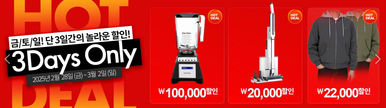 대표적인 할인 상품으로는 블렌텍 토탈 블렌더 2.6L와 게스 남성 후디 보머 자켓 그리고 무선청소기 등을 할인해서 판매하는데, 인기가 좋은 샤크 에보 파워시스템 무선 스틱 청소기는 이미 품절되었습니다.