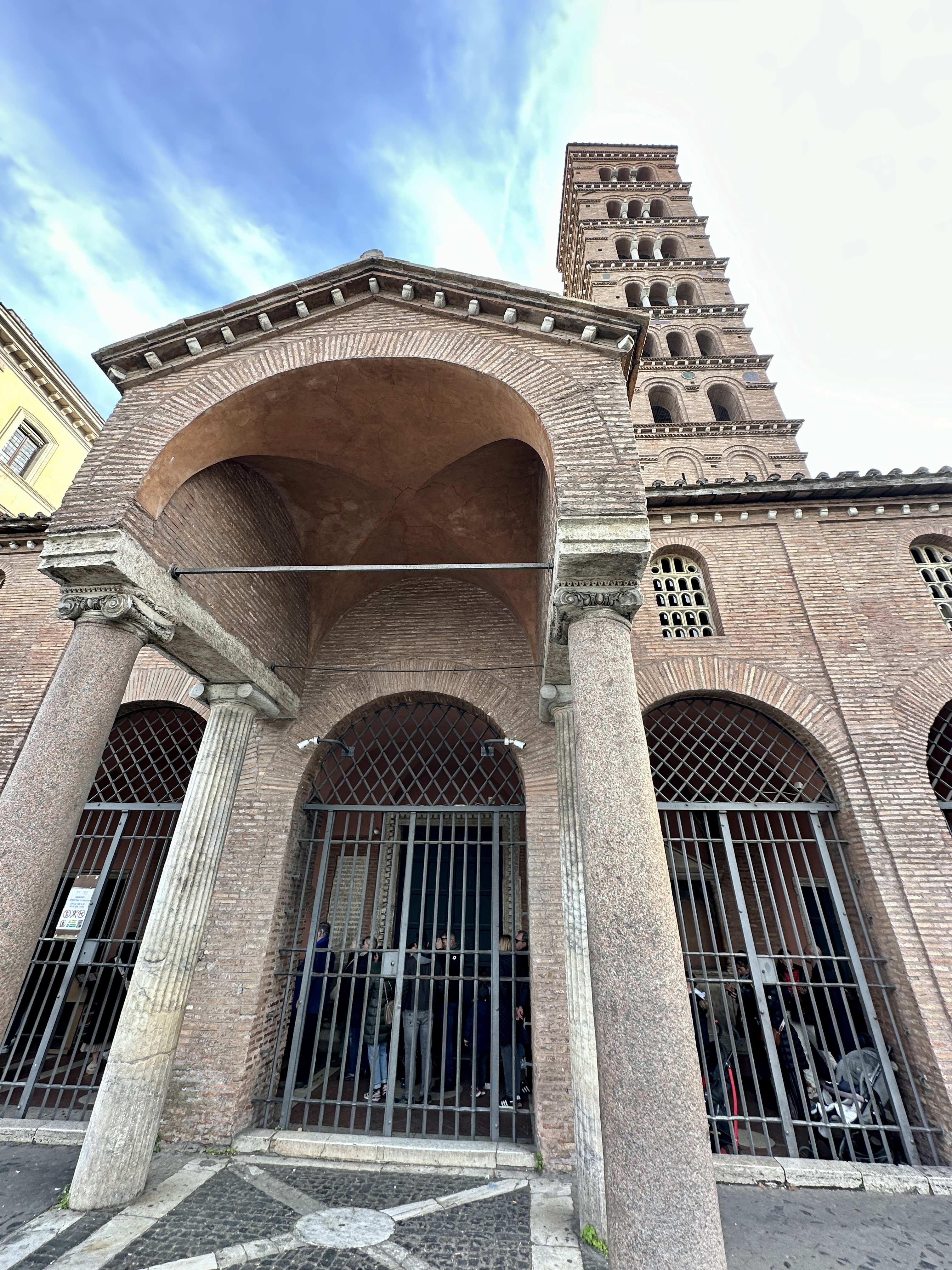 진실의 입이 위치하고 있는 산타 마리아 인 코스메딘 성당은 로마 시내에서 아름다운 성당 중 하나로 손꼽히는 성당인데, 매우 독특한 로마네스크양식 종탑과 모자이크로 장식된 바닥이 특징입니다.