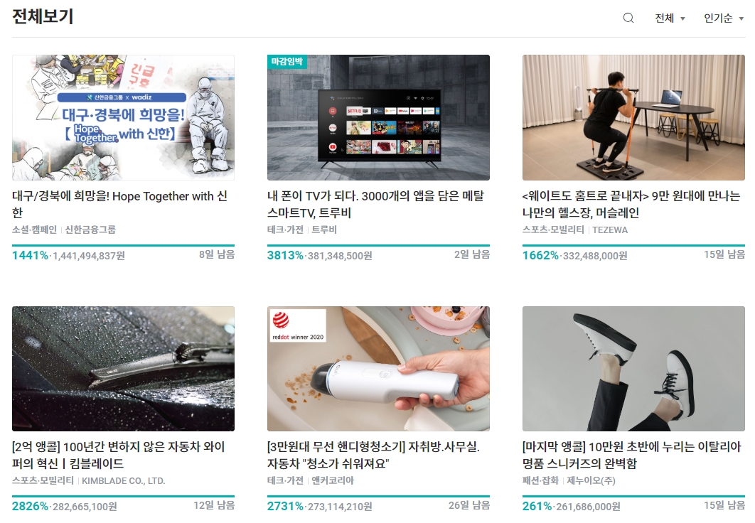 규모로는 국내 크라우드 펀딩 사이트 중 가장 큰 규모를 가지고 있다.