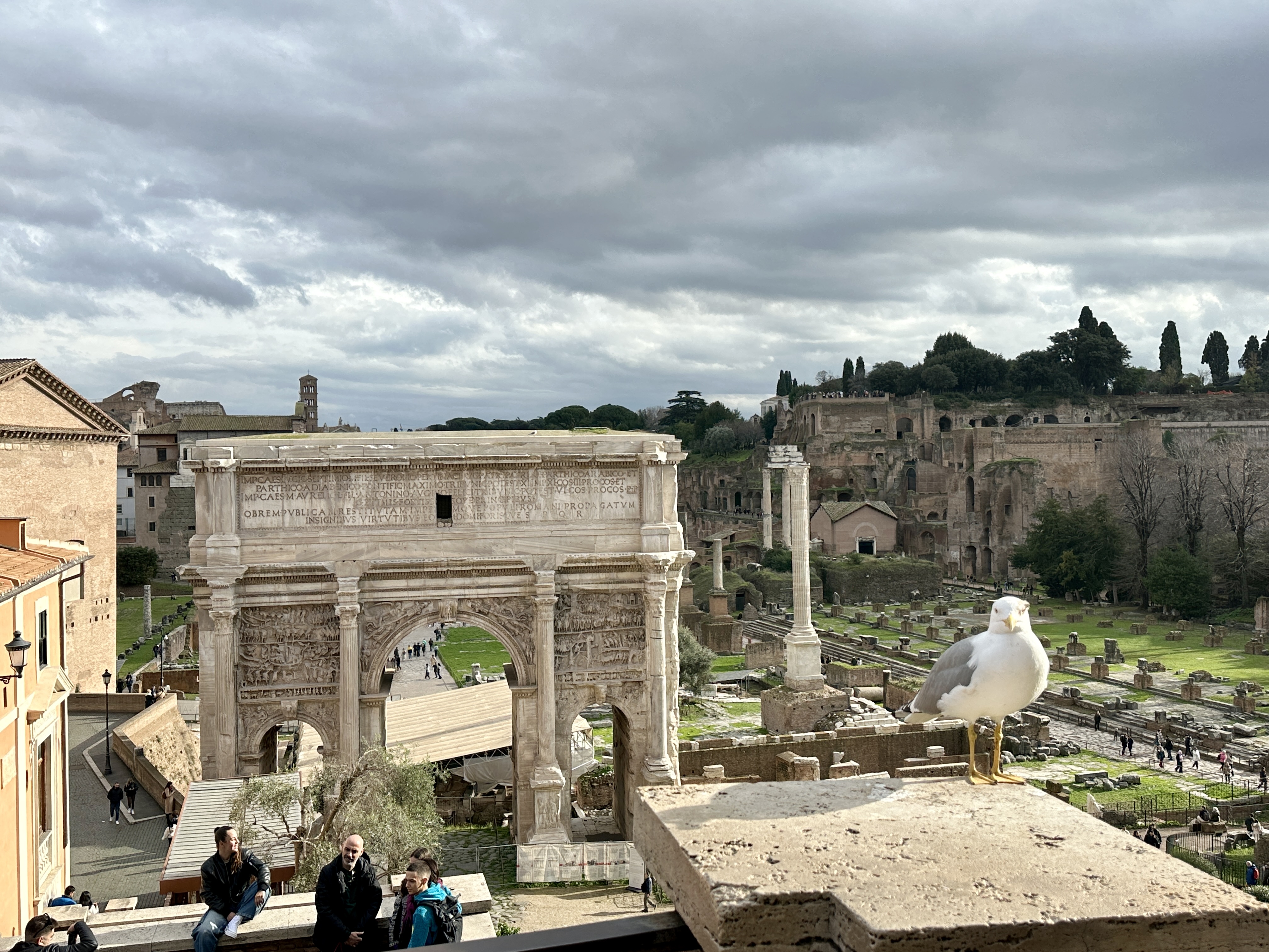 캄피돌리오 광장 뒤편으로 늑대 젖을 먹는 로물루스 형제 동상을 지나면 포로로마노가 한눈에 펼쳐지는 뷰가 나타납니다. 이날은 신기하게 사람을 무서워하지 않는 용감한 갈매기와 함께 포로로마노를 감상했습니다.