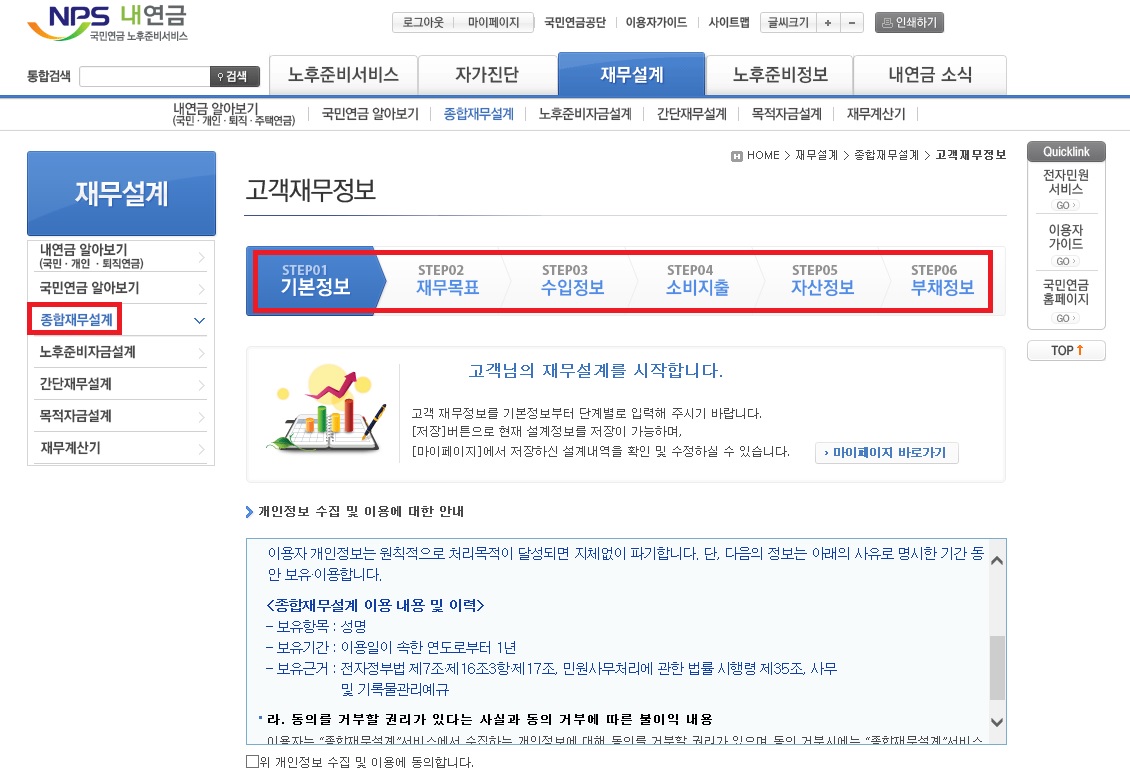 종합재무설계에 들어가면 차례대로 기본정보를 입력하고 상세하게 재무목표와 수입정보 소비지출 자산정보