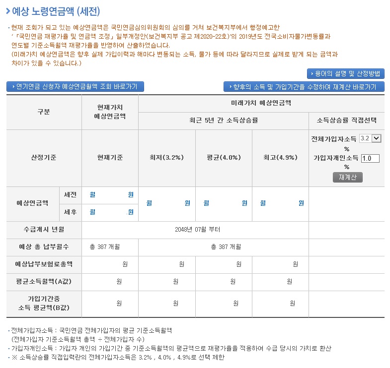 나는 총 387개월 (약 32년) 납입하고 2048년 7월부터 수령하는 것으로 나온다.